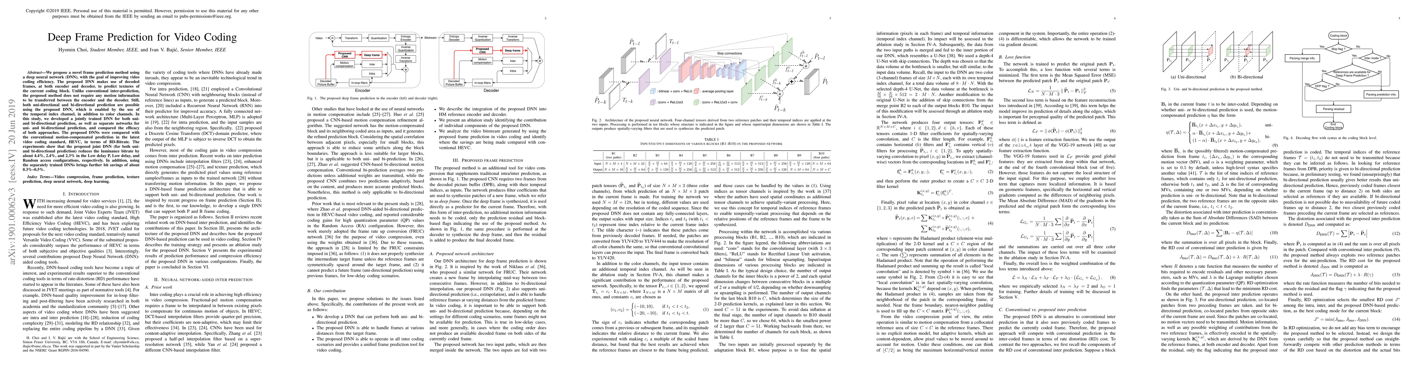 This paper proposes a novel deep neural network (DNN) for frame prediction in video coding, aiming to enhance coding efficiency without requiring motion information transfer. The DNN predicts textures using decoded frames, achieving both uni-directional and bi-directional prediction, and demonstrates significant bitrate reductions compared to conventional methods in HEVC configurations.
