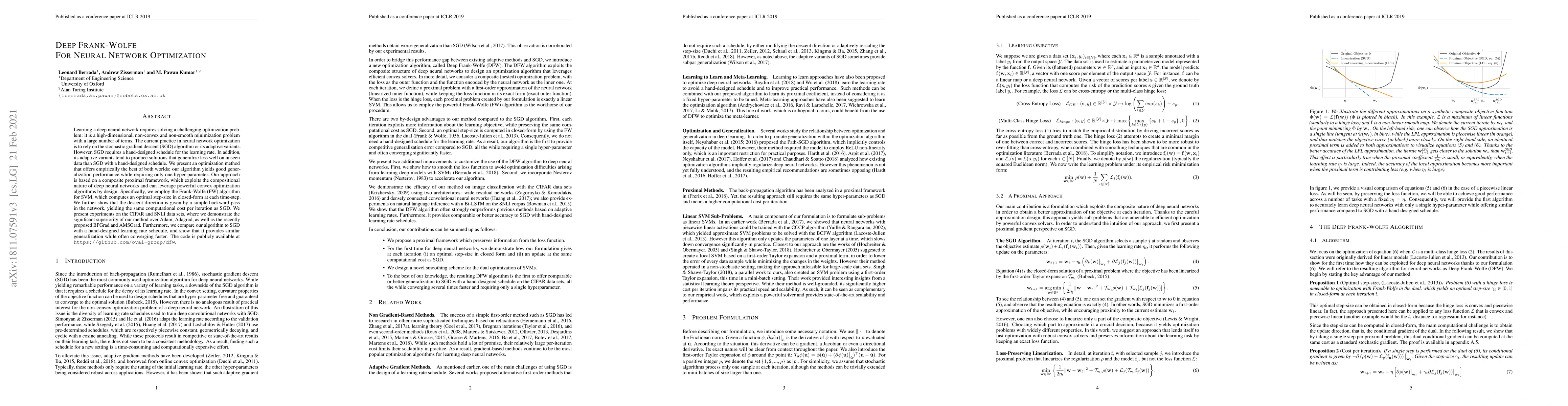 Learning a deep neural network requires solving a challenging optimization problem: it is a high-dimensional, non-convex and non-smooth minimization problem with a large number of terms. The current practice in neural network optimization is to rely on the stochastic gradient descent (SGD) algorithm or its adaptive variants. However, SGD requires a hand-designed schedule for the learning rate. In addition, its adaptive variants tend to produce solutions that generalize less well on unseen data than SGD with a hand-designed schedule. We present an optimization method that offers empirically the best of both worlds: our algorithm yields good generalization performance while requiring only one hyper-parameter. Our approach is based on a composite proximal framework, which exploits the compositional nature of deep neural networks and can leverage powerful convex optimization algorithms by design. Specifically, we employ the Frank-Wolfe (FW) algorithm for SVM, which computes an optimal step-size in closed-form at each time-step. We further show that the descent direction is given by a simple backward pass in the network, yielding the same computational cost per iteration as SGD. We present experiments on the CIFAR and SNLI data sets, where we demonstrate the significant superiority of our method over Adam, Adagrad, as well as the recently proposed BPGrad and AMSGrad. Furthermore, we compare our algorithm to SGD with a hand-designed learning rate schedule, and show that it provides similar generalization while converging faster. The code is publicly available at https://github.com/oval-group/dfw.