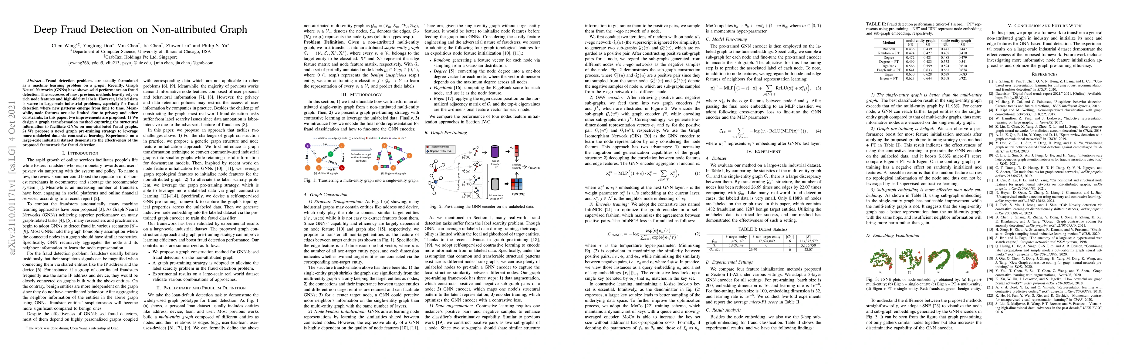 This paper proposes two improvements for deep fraud detection on non-attributed graphs: a graph transformation method to capture structural information and a graph pre-training strategy using contrastive learning to utilize unlabeled data. Experiments show the effectiveness of the proposed framework on a large-scale industrial dataset.