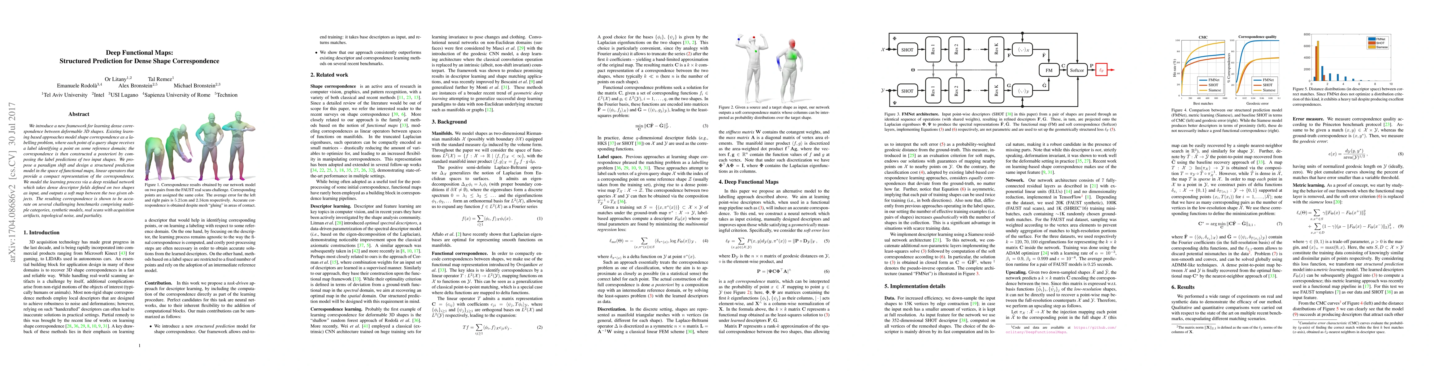 This paper introduces a novel framework for learning dense correspondence between deformable 3D shapes using structured prediction models in the space of functional maps. It employs a deep residual network to output a soft map between two shapes, demonstrating accuracy on various benchmarks.