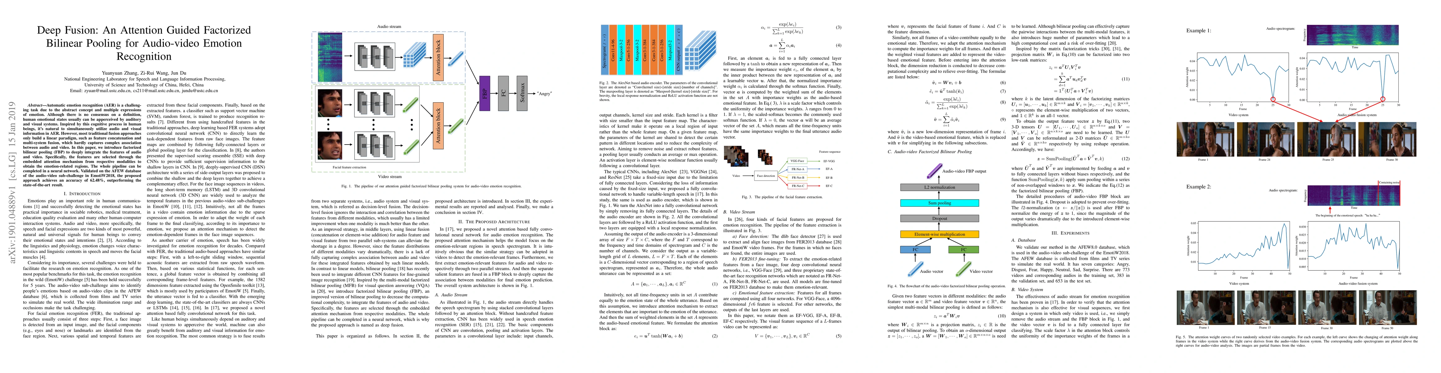 This paper proposes a deep fusion method using attention-guided factorized bilinear pooling to enhance audio-video emotion recognition. The method selects emotion-related features from audio and visual modalities and integrates them effectively, achieving a state-of-the-art accuracy of 62.48% on the AFEW database.