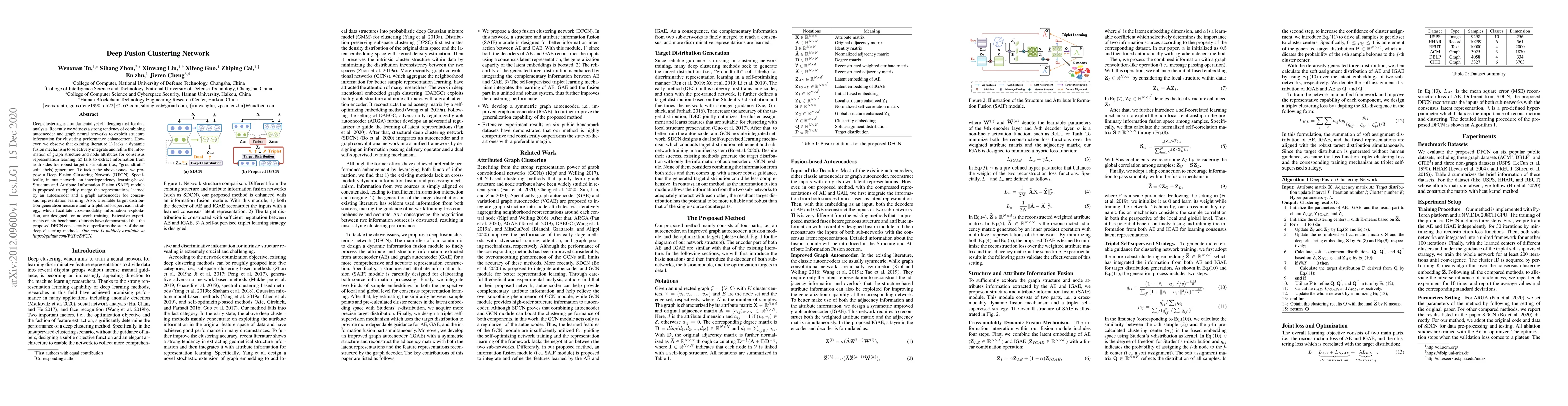 The Deep Fusion Clustering Network (DFCN) proposes a novel SAIF module for dynamic fusion of graph structure and node attribute information, and introduces a reliable target distribution generation and triplet self-supervision strategy for robust training, achieving superior performance over existing deep clustering methods on six benchmark datasets.