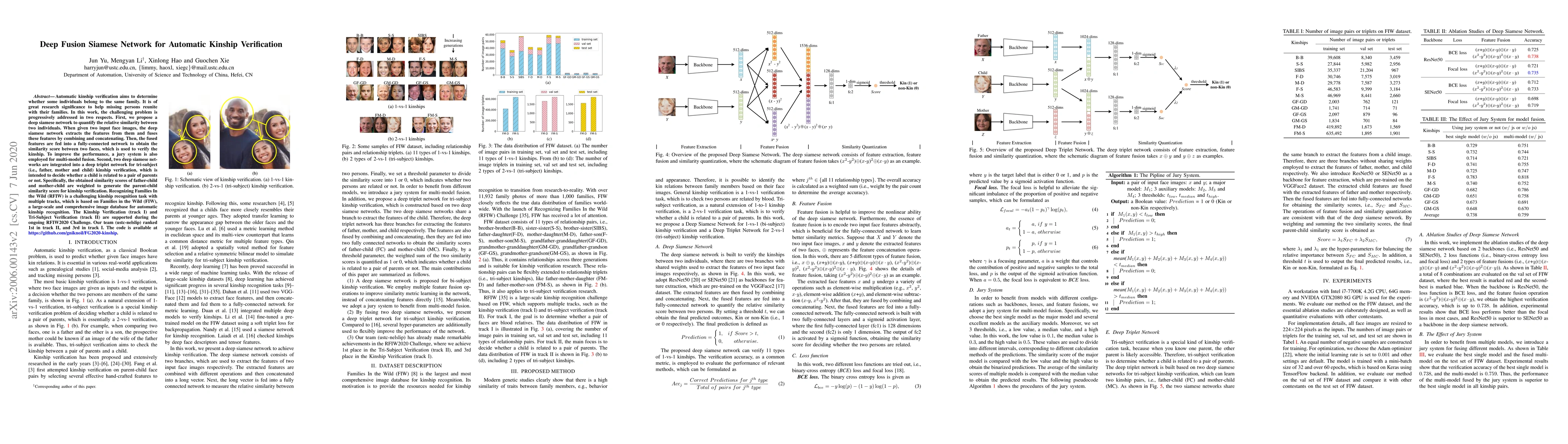 This paper proposes a deep fusion Siamese network for automatic kinship verification, utilizing a deep Siamese network to quantify similarity between two faces and integrating it with a jury system for multi-model fusion. Additionally, a deep triplet network is employed for tri-subject verification, achieving first place in the Tri-Subject Verification track and third place in the Kinship Verification track of the RFIW2020 Challenge.