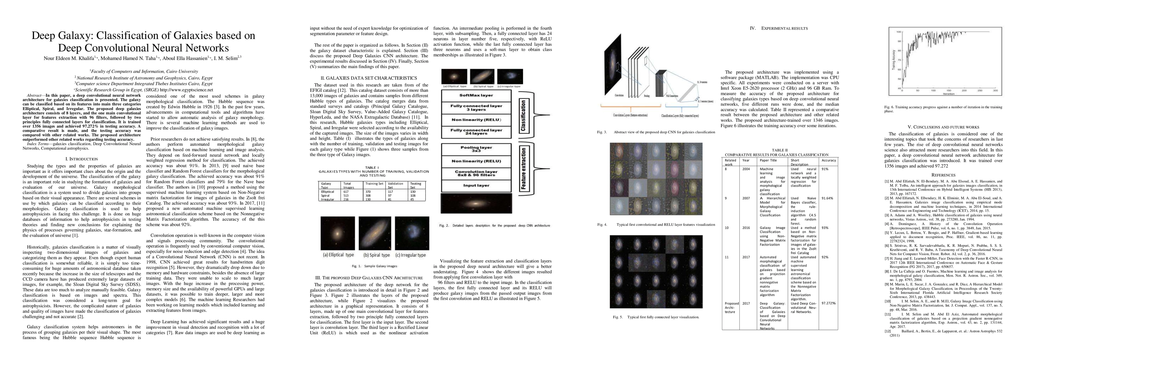 This paper introduces a deep convolutional neural network for classifying galaxies into Elliptical, Spiral, and Irregular types, achieving 97.272% testing accuracy. The architecture, consisting of 8 layers including a convolutional layer with 96 filters, outperforms other methods in accuracy.