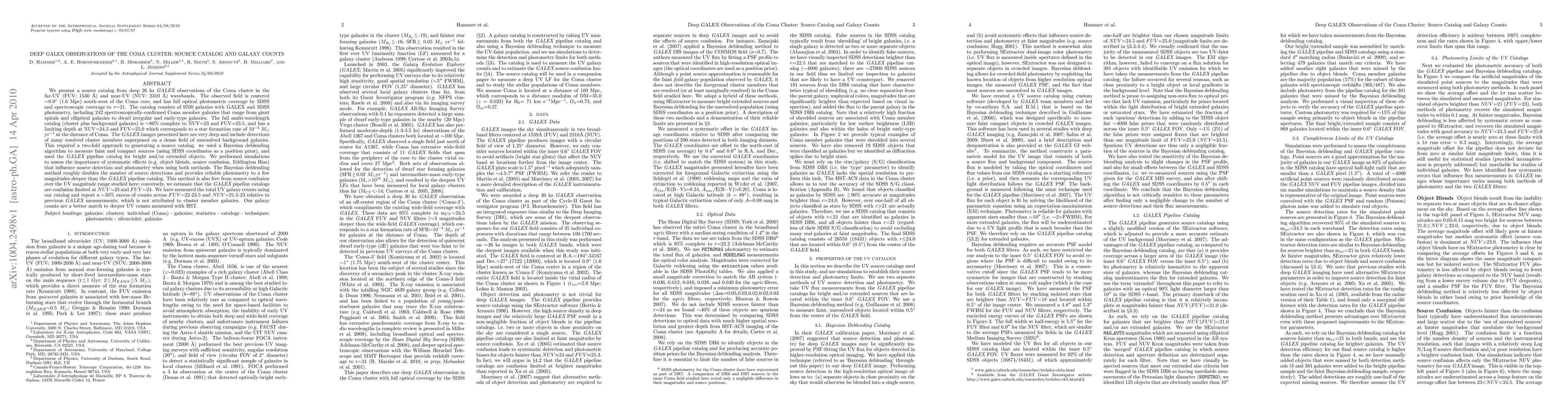 This paper presents a deep GALEX catalog of the Coma cluster, featuring 9700 galaxies with far-UV and near-UV photometry, including 242 spectroscopically confirmed cluster members. The catalog employs a Bayesian deblending algorithm for faint sources and the GALEX pipeline for bright objects, revealing a ~50% excess in UV galaxy counts compared to previous measurements, aligning better with HST counts.