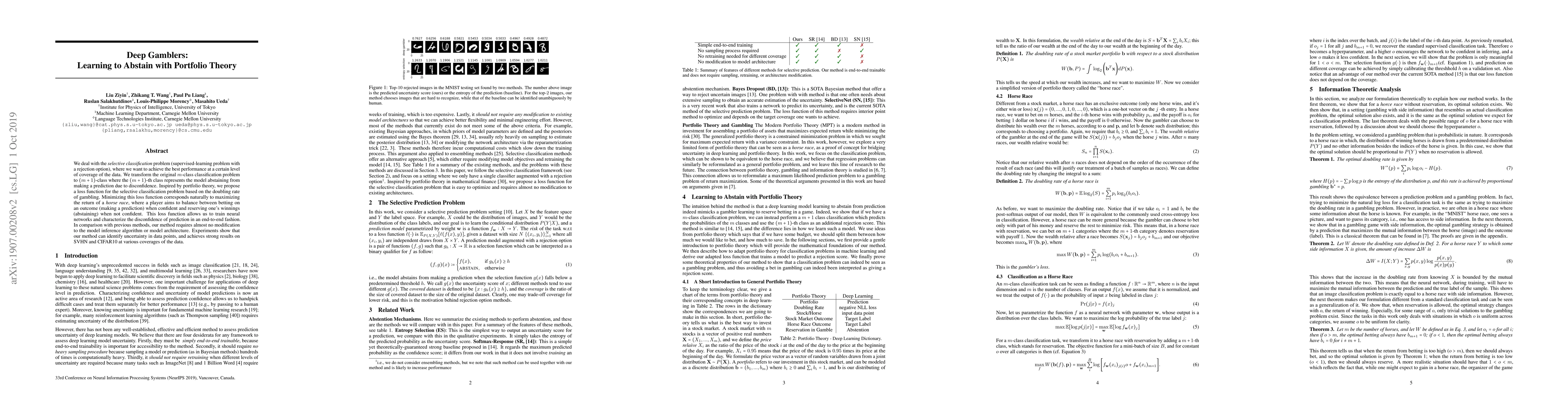 We deal with the \textit{selective classification} problem (supervised-learning problem with a rejection option), where we want to achieve the best performance at a certain level of coverage of the data. We transform the original $m$-class classification problem to $(m+1)$-class where the $(m+1)$-th class represents the model abstaining from making a prediction due to disconfidence. Inspired by portfolio theory, we propose a loss function for the selective classification problem based on the doubling rate of gambling. Minimizing this loss function corresponds naturally to maximizing the return of a \textit{horse race}, where a player aims to balance between betting on an outcome (making a prediction) when confident and reserving one's winnings (abstaining) when not confident. This loss function allows us to train neural networks and characterize the disconfidence of prediction in an end-to-end fashion. In comparison with previous methods, our method requires almost no modification to the model inference algorithm or model architecture. Experiments show that our method can identify uncertainty in data points, and achieves strong results on SVHN and CIFAR10 at various coverages of the data.