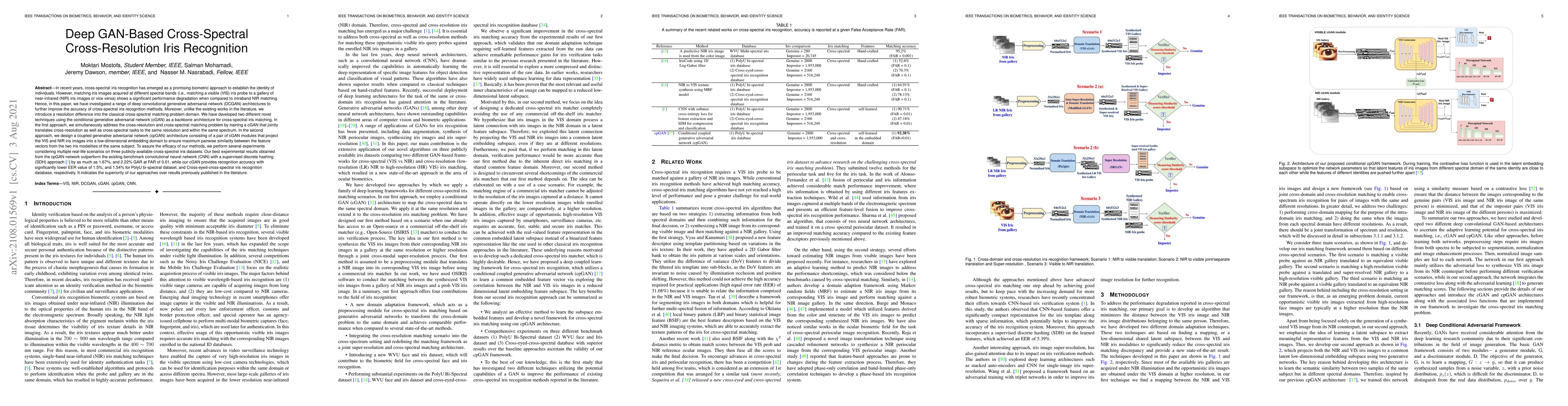 This paper explores deep convolutional generative adversarial network (DCGAN) architectures to enhance cross-spectral iris recognition, addressing both spectral and resolution differences. It introduces two cGAN-based techniques: one jointly translating cross-resolution and cross-spectral tasks, and another using a coupled GAN (cpGAN) to project visible and near-infrared iris images into a low-dimensional embedding domain for improved matching.