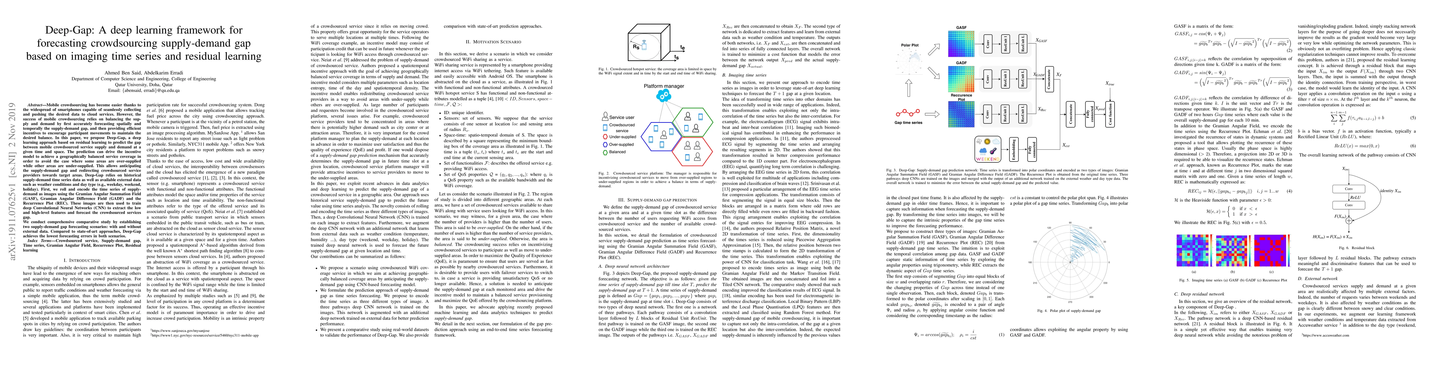 Mobile crowdsourcing has become easier thanks to the widespread of smartphones capable of seamlessly collecting and pushing the desired data to cloud services. However, the success of mobile crowdsourcing relies on balancing the supply and demand by first accurately forecasting spatially and temporally the supply-demand gap, and then providing efficient incentives to encourage participant movements to maintain the desired balance. In this paper, we propose Deep-Gap, a deep learning approach based on residual learning to predict the gap between mobile crowdsourced service supply and demand at a given time and space. The prediction can drive the incentive model to achieve a geographically balanced service coverage in order to avoid the case where some areas are over-supplied while other areas are under-supplied. This allows anticipating the supply-demand gap and redirecting crowdsourced service providers towards target areas. Deep-Gap relies on historical supply-demand time series data as well as available external data such as weather conditions and day type (e.g., weekday, weekend, holiday). First, we roll and encode the time series of supply-demand as images using the Gramian Angular Summation Field (GASF), Gramian Angular Difference Field (GADF) and the Recurrence Plot (REC). These images are then used to train deep Convolutional Neural Networks (CNN) to extract the low and high-level features and forecast the crowdsourced services gap. We conduct comprehensive comparative study by establishing two supply-demand gap forecasting scenarios: with and without external data. Compared to state-of-art approaches, Deep-Gap achieves the lowest forecasting errors in both scenarios.