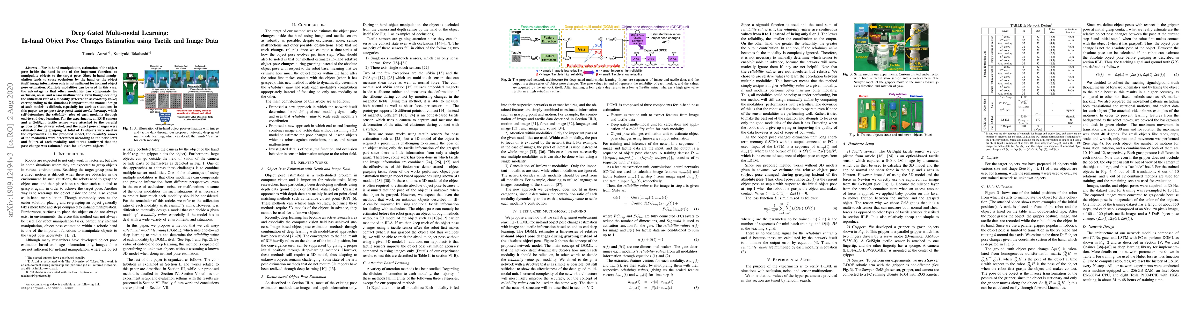 This paper proposes a deep gated multi-modal learning approach to estimate in-hand object pose changes using tactile and image data. The model dynamically determines the reliability of each modality to compensate for occlusions and sensor issues, achieving accurate pose estimation even for unseen objects.