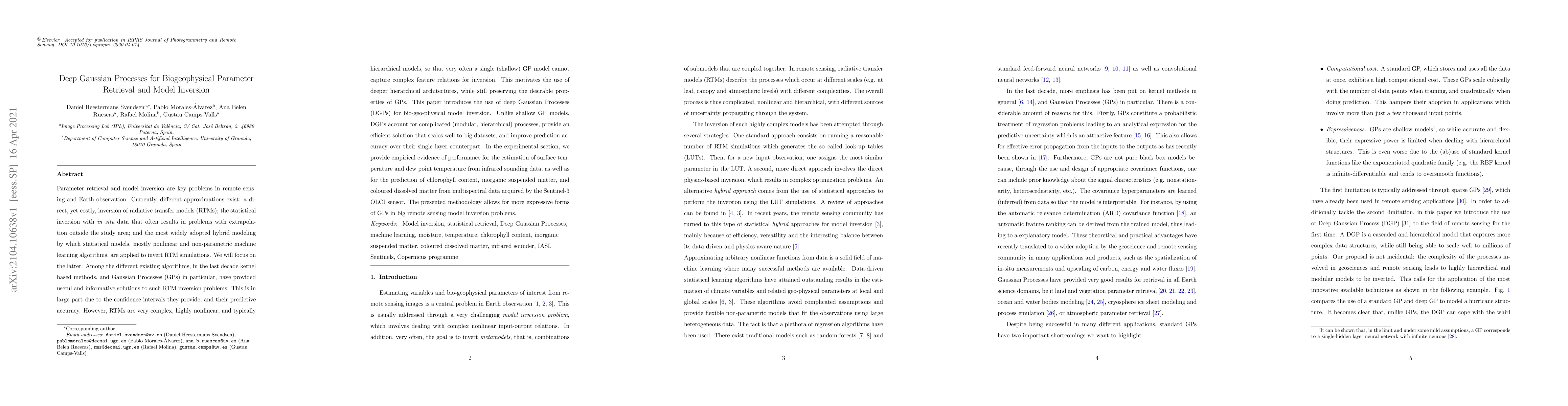 This paper introduces a new method called Deep Gaussian Processes for biogeophysical parameter retrieval and model inversion, which uses deep hierarchical architectures to improve prediction accuracy and scale well to large datasets.