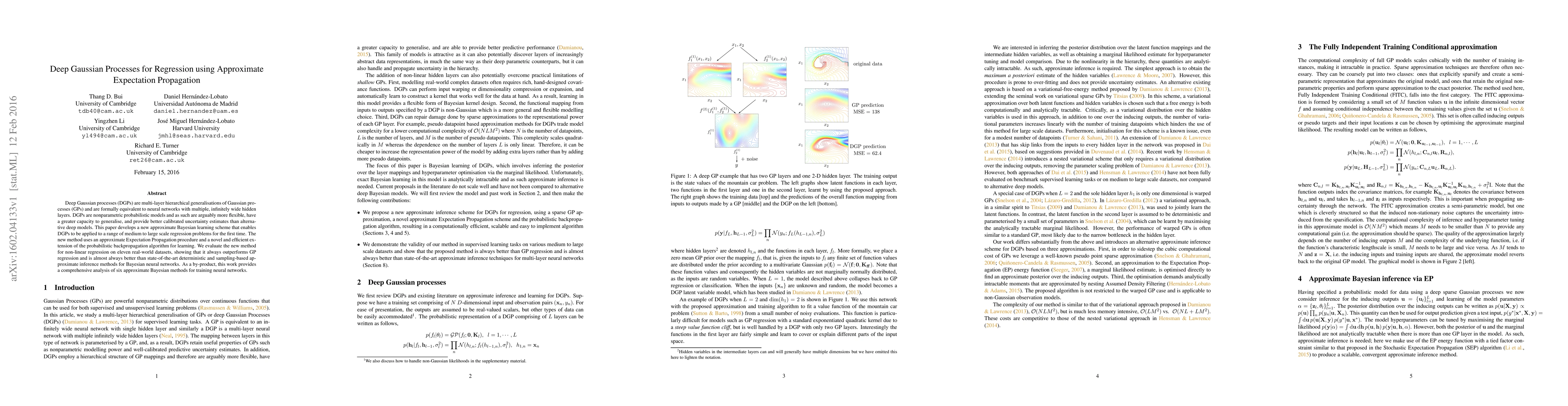 Deep Gaussian processes (DGPs) are multi-layer hierarchical generalisations of Gaussian processes (GPs) and are formally equivalent to neural networks with multiple, infinitely wide hidden layers. DGPs are nonparametric probabilistic models and as such are arguably more flexible, have a greater capacity to generalise, and provide better calibrated uncertainty estimates than alternative deep models. This paper develops a new approximate Bayesian learning scheme that enables DGPs to be applied to a range of medium to large scale regression problems for the first time. The new method uses an approximate Expectation Propagation procedure and a novel and efficient extension of the probabilistic backpropagation algorithm for learning. We evaluate the new method for non-linear regression on eleven real-world datasets, showing that it always outperforms GP regression and is almost always better than state-of-the-art deterministic and sampling-based approximate inference methods for Bayesian neural networks. As a by-product, this work provides a comprehensive analysis of six approximate Bayesian methods for training neural networks.