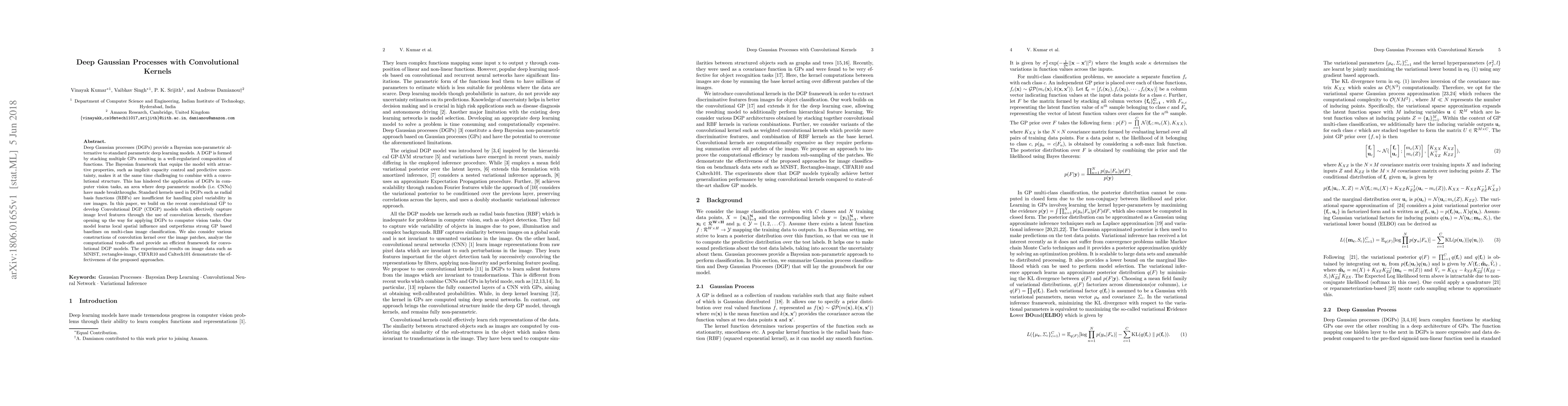 This paper introduces Convolutional Deep Gaussian Processes (CDGP) that combine deep Gaussian processes with convolutional kernels to handle image data effectively. The proposed model outperforms traditional Gaussian process baselines in image classification tasks and demonstrates computational efficiency.