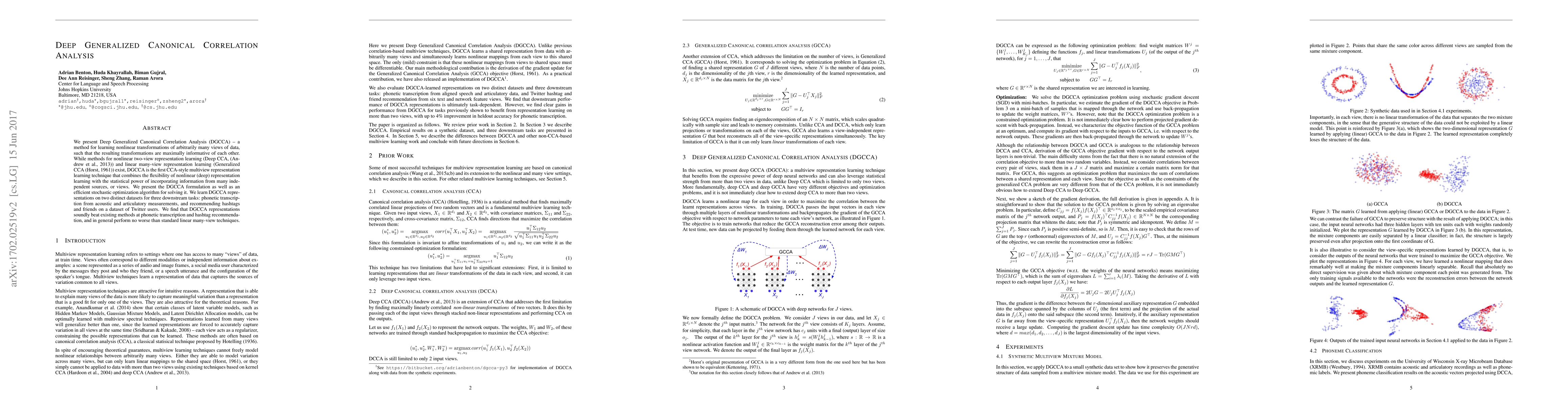 Deep Generalized Canonical Correlation Analysis (DGCCA) combines nonlinear deep learning with statistical power from multiple data views. DGCCA outperforms existing methods in phonetic transcription and hashtag recommendation tasks while maintaining competitive performance in general.