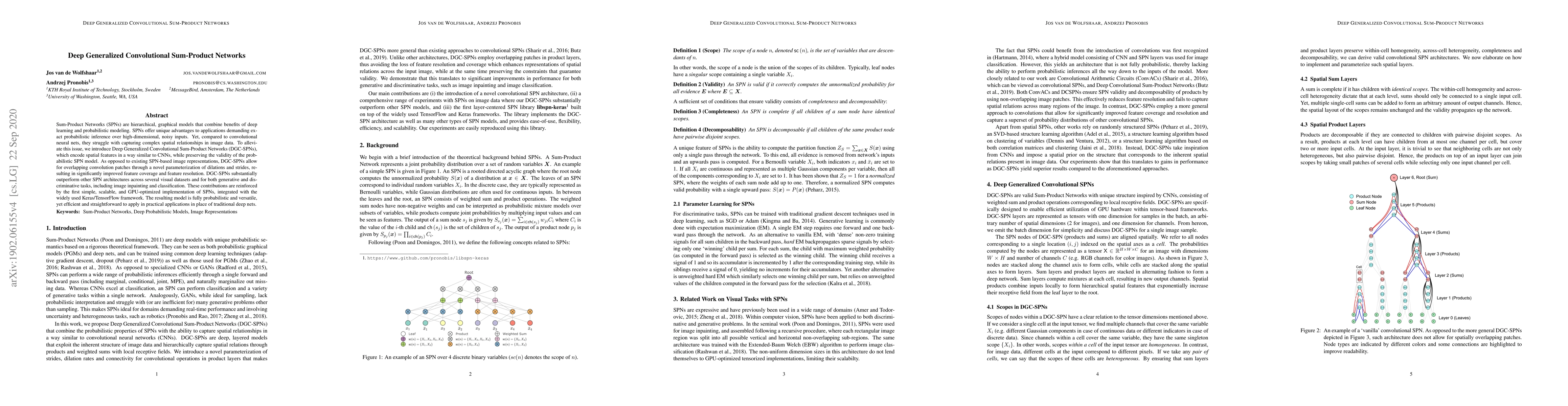 This paper introduces Deep Generalized Convolutional Sum-Product Networks (DGC-SPNs) to combine the benefits of deep learning and probabilistic modeling for image data. DGC-SPNs outperform existing SPN architectures by capturing complex spatial relationships through overlapping convolution patches, leading to better feature coverage and resolution.
