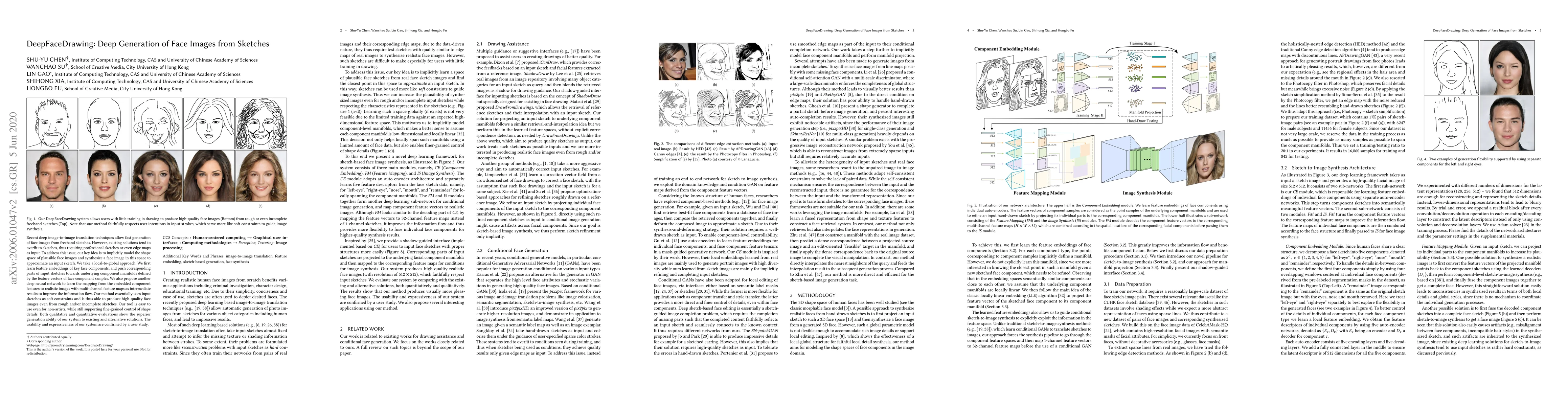 Recent deep image-to-image translation techniques allow fast generation of face images from freehand sketches. However, existing solutions tend to overfit to sketches, thus requiring professional sketches or even edge maps as input. To address this issue, our key idea is to implicitly model the shape space of plausible face images and synthesize a face image in this space to approximate an input sketch. We take a local-to-global approach. We first learn feature embeddings of key face components, and push corresponding parts of input sketches towards underlying component manifolds defined by the feature vectors of face component samples. We also propose another deep neural network to learn the mapping from the embedded component features to realistic images with multi-channel feature maps as intermediate results to improve the information flow. Our method essentially uses input sketches as soft constraints and is thus able to produce high-quality face images even from rough and/or incomplete sketches. Our tool is easy to use even for non-artists, while still supporting fine-grained control of shape details. Both qualitative and quantitative evaluations show the superior generation ability of our system to existing and alternative solutions. The usability and expressiveness of our system are confirmed by a user study.