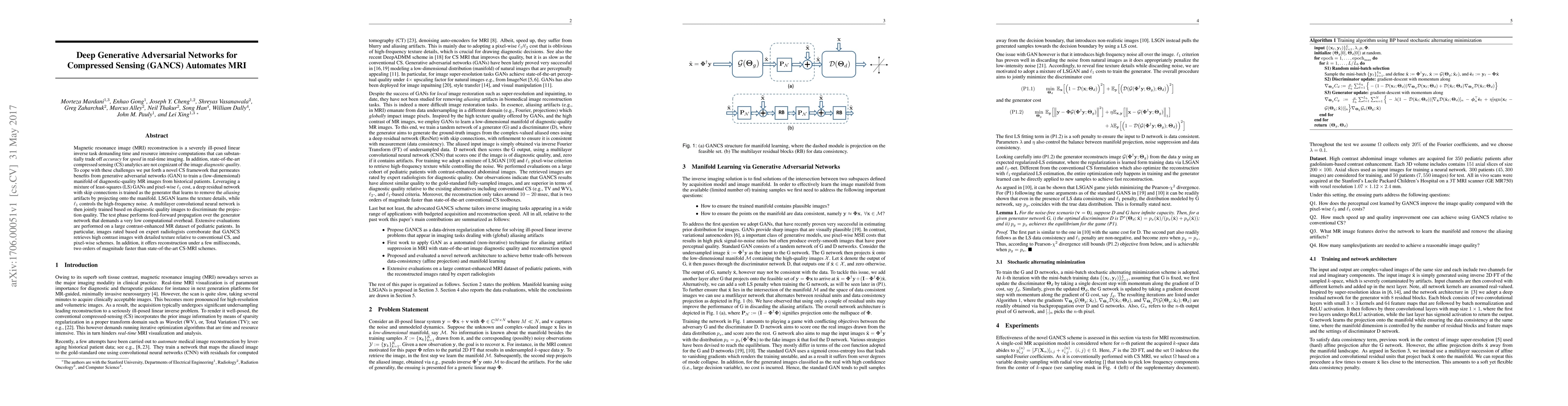 This paper proposes a deep generative adversarial network (GAN) framework for compressed sensing MRI reconstruction that significantly speeds up the process while maintaining high diagnostic image quality. The framework employs a trained deep residual network to reduce aliasing artifacts and generate high-quality images, outperforming conventional compressed sensing techniques both in speed and image fidelity.