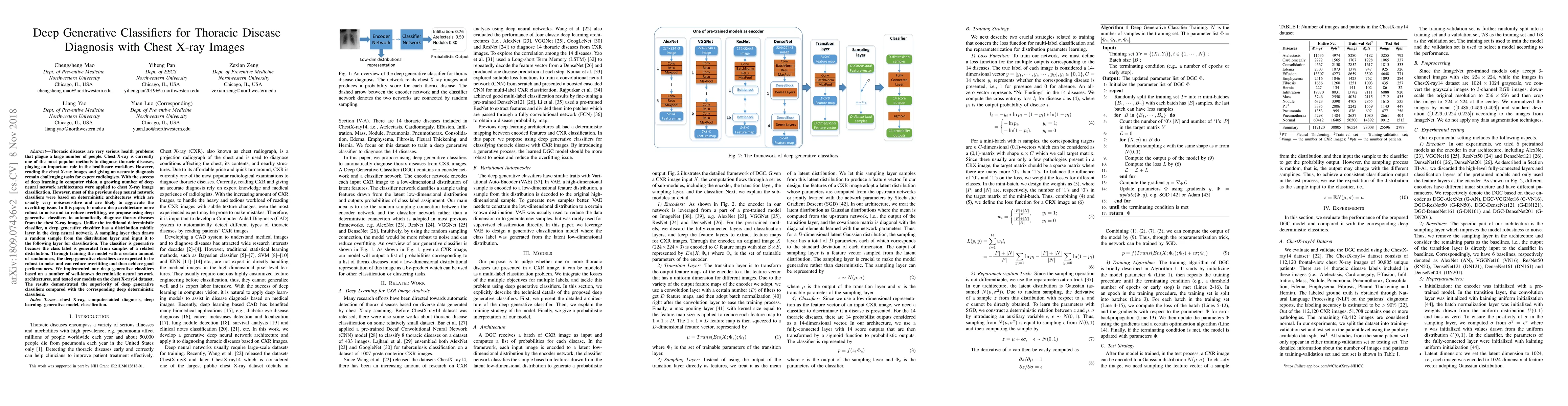 This paper proposes deep generative classifiers to improve the diagnosis of thoracic diseases from chest X-ray images, addressing noise sensitivity and overfitting issues. Unlike traditional deterministic classifiers, these generative models incorporate a distribution middle layer and random sampling to enhance robustness and reduce overfitting, achieving better performance on the chest X-ray14 dataset.