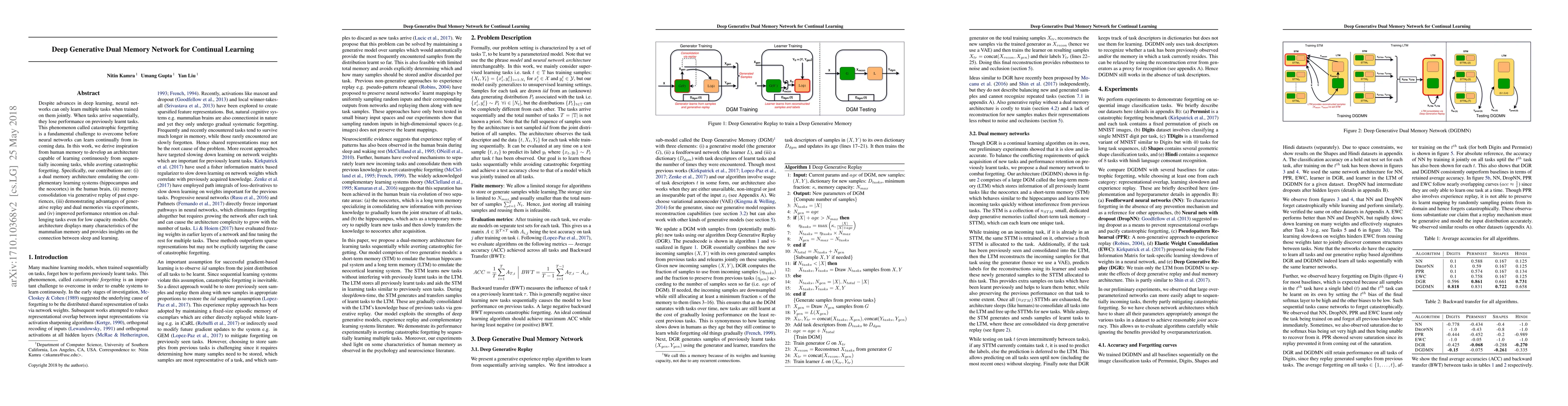 This paper proposes a Deep Generative Dual Memory Network to address continual learning challenges by mimicking the human brain's memory systems. The architecture features dual memory components and generative replay to prevent catastrophic forgetting, demonstrating improved performance retention on sequential tasks.