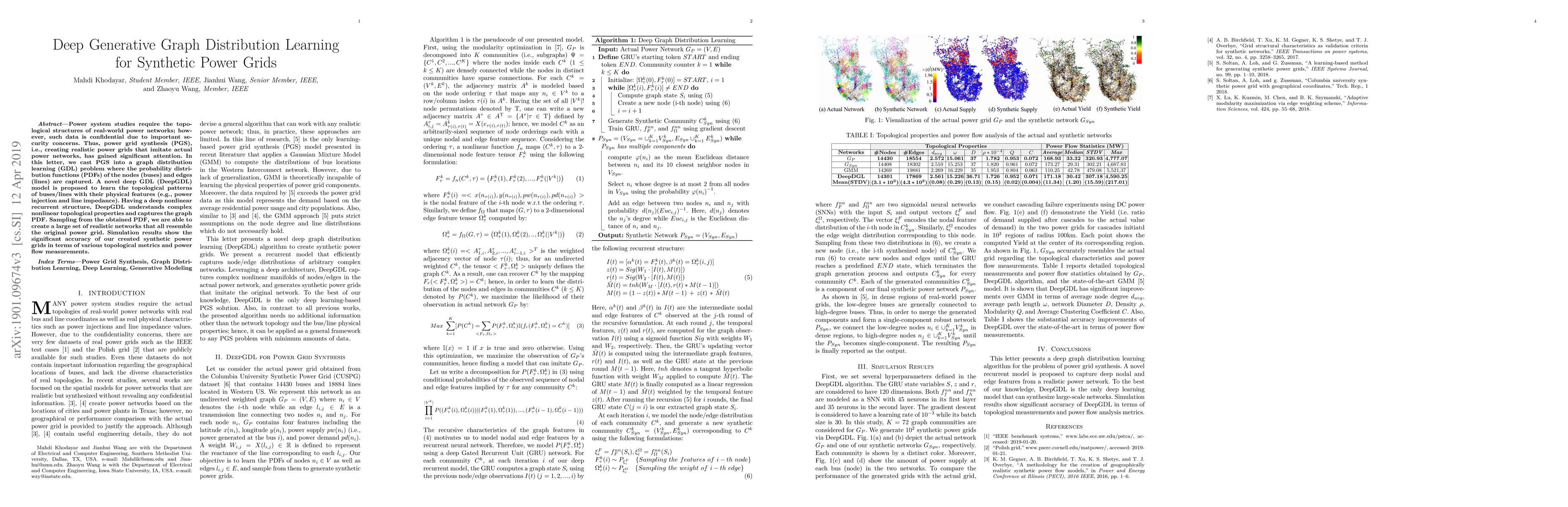 This paper proposes a deep generative graph distribution learning (DeepGDL) model to synthesize realistic power grids by capturing the topological patterns and physical features of nodes and edges. The model's accuracy in replicating real power grid structures is demonstrated through topological metrics and power flow measurements.