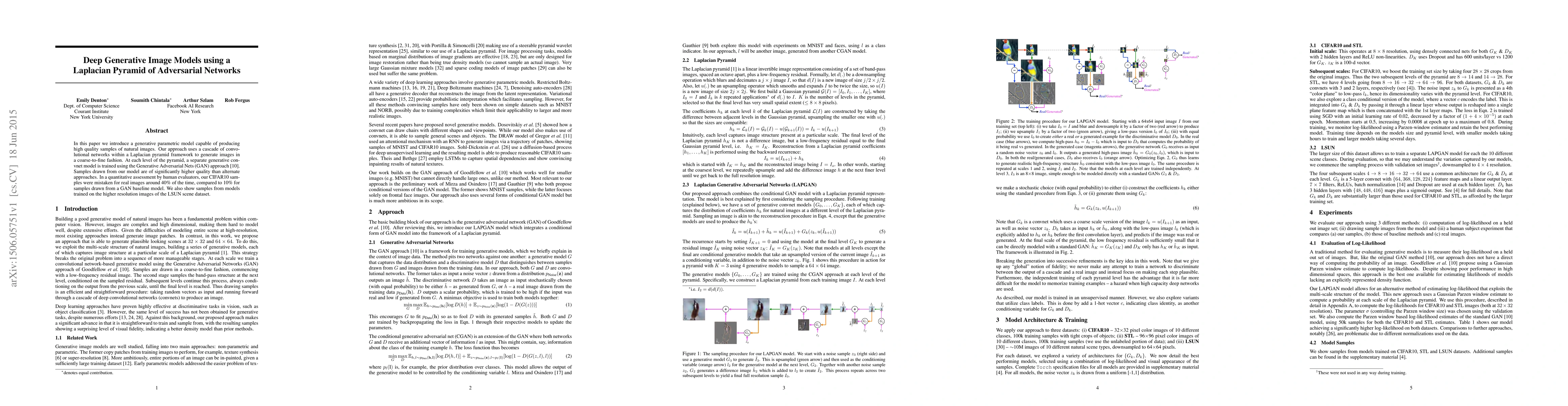 In this paper we introduce a generative parametric model capable of producing high quality samples of natural images. Our approach uses a cascade of convolutional networks within a Laplacian pyramid framework to generate images in a coarse-to-fine fashion. At each level of the pyramid, a separate generative convnet model is trained using the Generative Adversarial Nets (GAN) approach (Goodfellow et al.). Samples drawn from our model are of significantly higher quality than alternate approaches. In a quantitative assessment by human evaluators, our CIFAR10 samples were mistaken for real images around 40% of the time, compared to 10% for samples drawn from a GAN baseline model. We also show samples from models trained on the higher resolution images of the LSUN scene dataset.