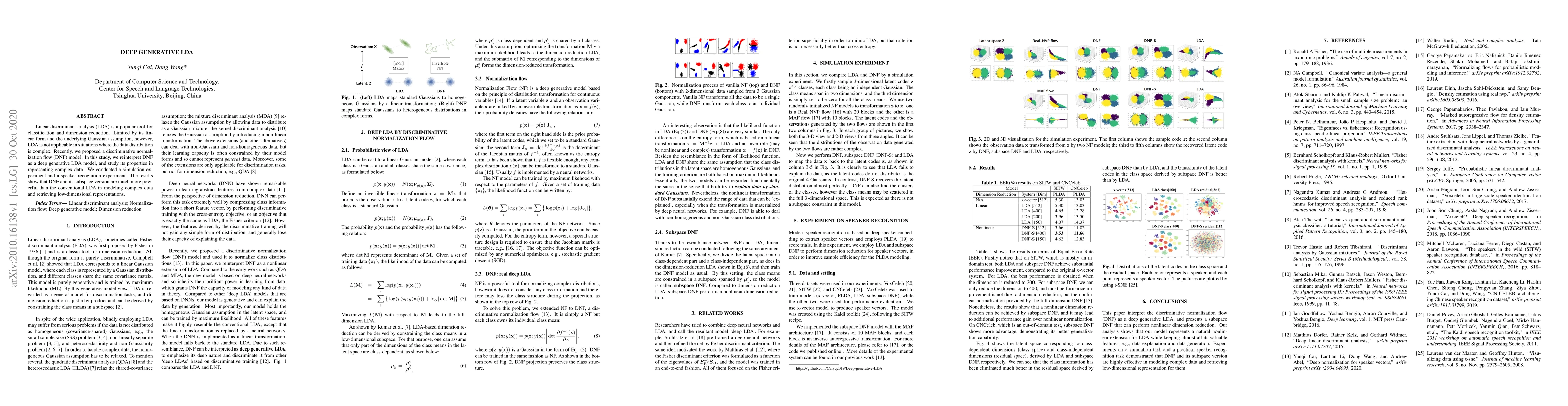 This paper reinterprets the discriminative normalization flow (DNF) model as a deep generative LDA, demonstrating its superior performance over conventional LDA in modeling complex data distributions through simulation and speaker recognition experiments. The results indicate DNF's effectiveness in generating low-dimensional representations.