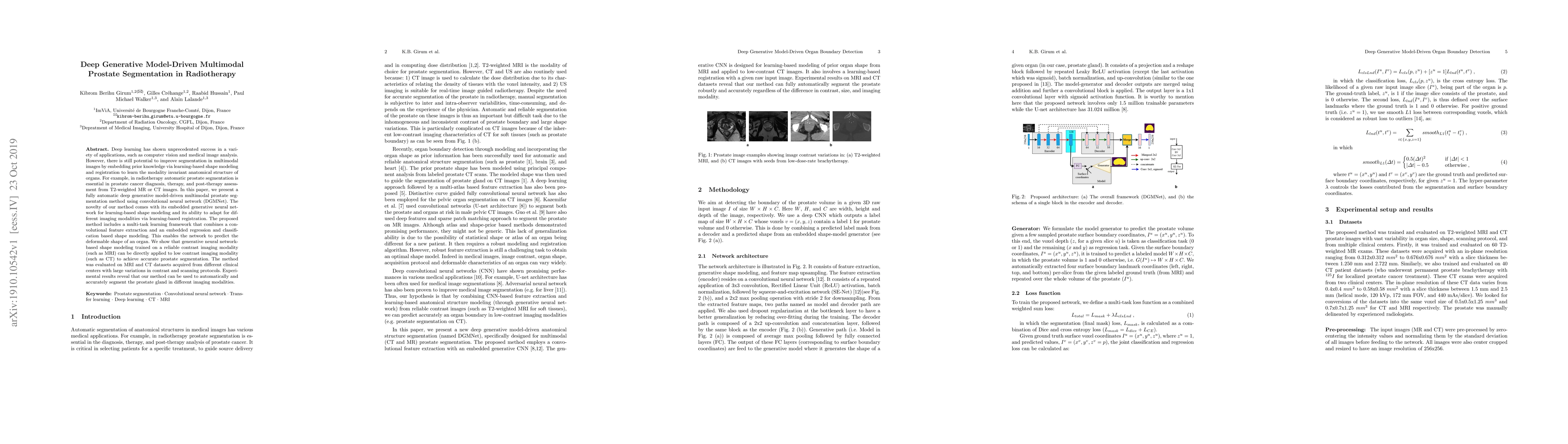 This paper introduces a deep generative model-driven method (DGMNet) for fully automatic multimodal prostate segmentation in radiotherapy, leveraging convolutional neural networks and multi-task learning for shape modeling and registration across T2-weighted MR and CT images. The method demonstrates accurate segmentation across different imaging modalities.