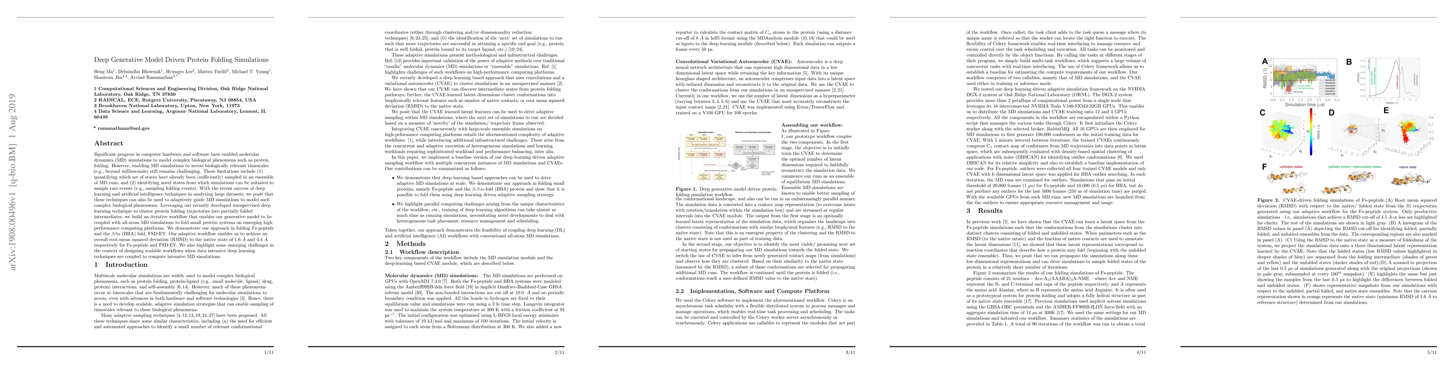 This paper proposes a deep generative model to adaptively guide molecular dynamics simulations for protein folding, achieving RMSDs of 1.6 Å for Fs-peptide and 4.4 Å for BBA fold. It addresses challenges in sampling rare events and insufficiently sampled states by leveraging deep learning to cluster folding trajectories.