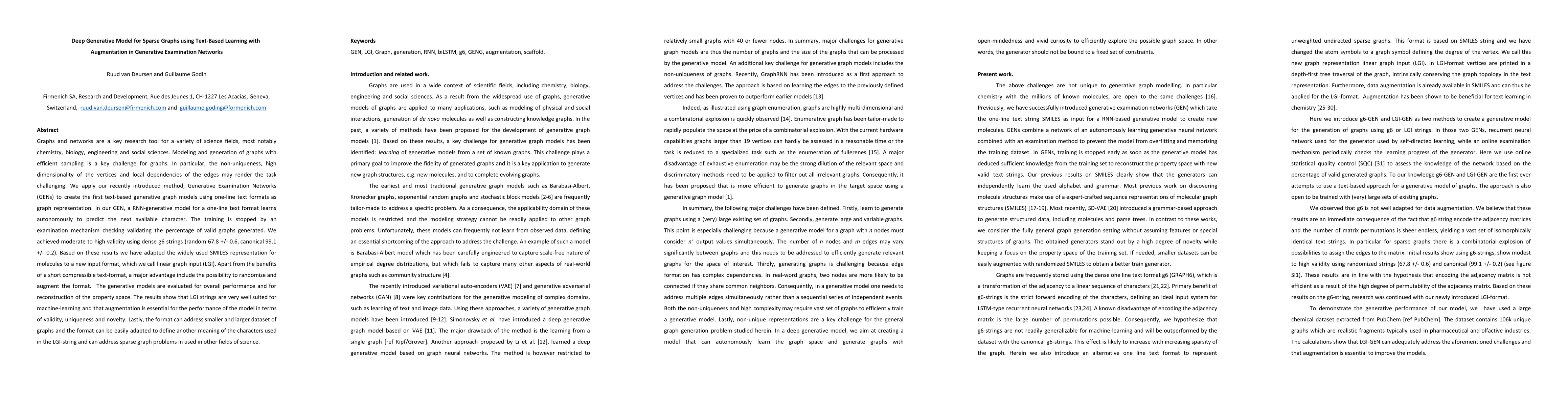 Graphs and networks are a key research tool for a variety of science fields, most notably chemistry, biology, engineering and social sciences. Modeling and generation of graphs with efficient sampling is a key challenge for graphs. In particular, the non-uniqueness, high dimensionality of the vertices and local dependencies of the edges may render the task challenging. We apply our recently introduced method, Generative Examination Networks (GENs) to create the first text-based generative graph models using one-line text formats as graph representation. In our GEN, a RNN-generative model for a one-line text format learns autonomously to predict the next available character. The training is stopped by an examination mechanism checking validating the percentage of valid graphs generated. We achieved moderate to high validity using dense g6 strings (random 67.8 +/- 0.6, canonical 99.1 +/- 0.2). Based on these results we have adapted the widely used SMILES representation for molecules to a new input format, which we call linear graph input (LGI). Apart from the benefits of a short compressible text-format, a major advantage include the possibility to randomize and augment the format. The generative models are evaluated for overall performance and for reconstruction of the property space. The results show that LGI strings are very well suited for machine-learning and that augmentation is essential for the performance of the model in terms of validity, uniqueness and novelty. Lastly, the format can address smaller and larger dataset of graphs and the format can be easily adapted to define another meaning of the characters used in the LGI-string and can address sparse graph problems in used in other fields of science.