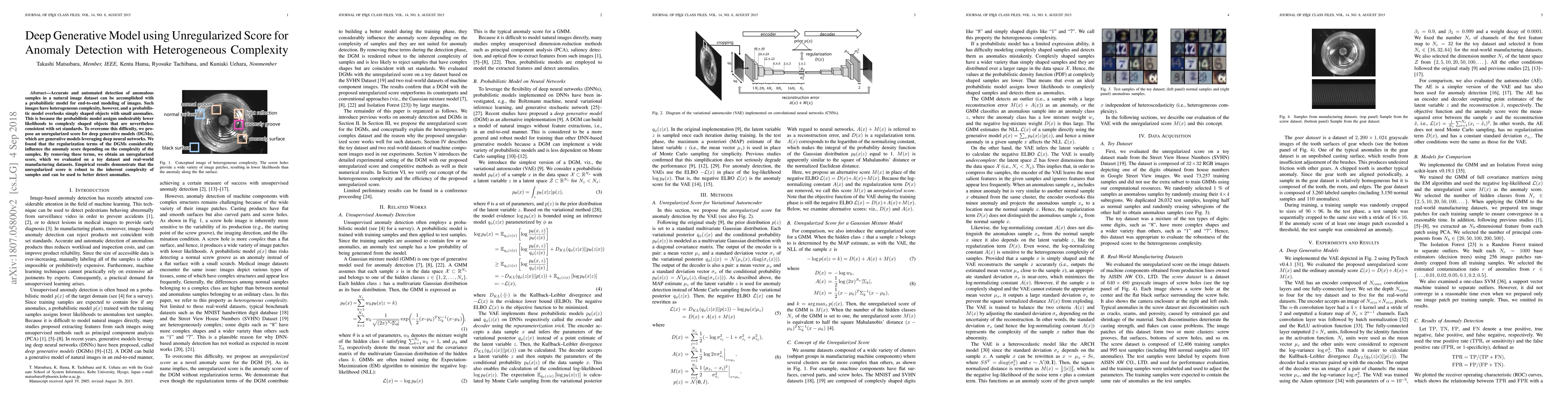 This paper proposes an unregularized score for deep generative models to improve anomaly detection in images with heterogeneous complexity. It shows that removing regularization terms enhances the model's ability to detect anomalies in complexly shaped objects, outperforming traditional probabilistic models.