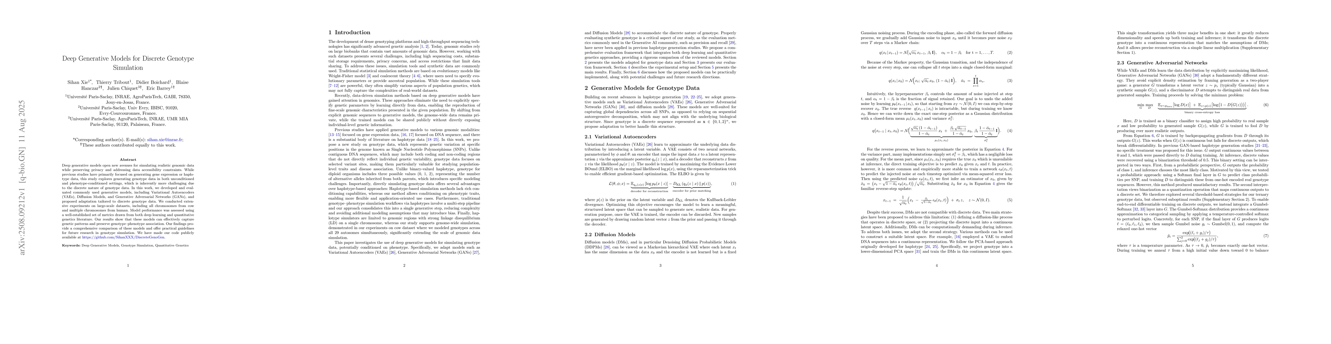 Deep generative models open new avenues for simulating realistic genomic data while preserving privacy and addressing data accessibility constraints. While previous studies have primarily focused on generating gene expression or haplotype data, this study explores generating genotype data in both unconditioned and phenotype-conditioned settings, which is inherently more challenging due to the discrete nature of genotype data. In this work, we developed and evaluated commonly used generative models, including Variational Autoencoders (VAEs), Diffusion Models, and Generative Adversarial Networks (GANs), and proposed adaptation tailored to discrete genotype data. We conducted extensive experiments on large-scale datasets, including all chromosomes from cow and multiple chromosomes from human. Model performance was assessed using a well-established set of metrics drawn from both deep learning and quantitative genetics literature. Our results show that these models can effectively capture genetic patterns and preserve genotype-phenotype association. Our findings provide a comprehensive comparison of these models and offer practical guidelines for future research in genotype simulation. We have made our code publicly available at https://github.com/SihanXXX/DiscreteGenoGen.