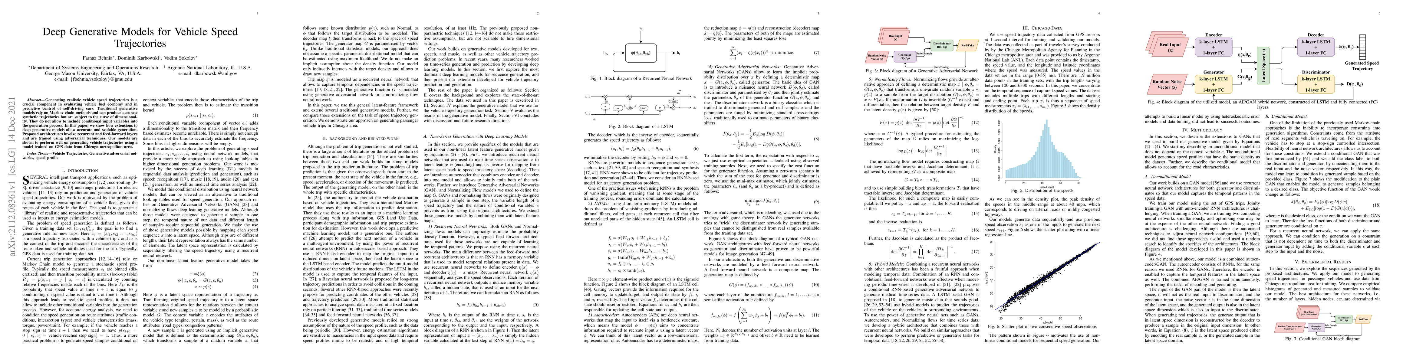 This paper proposes advanced deep generative models incorporating recurrent and feed-forward layers to generate realistic vehicle speed trajectories, overcoming the limitations of traditional Markov-based methods. The models, trained using adversarial techniques, demonstrate scalability and accuracy, validated through GPS data from Chicago.