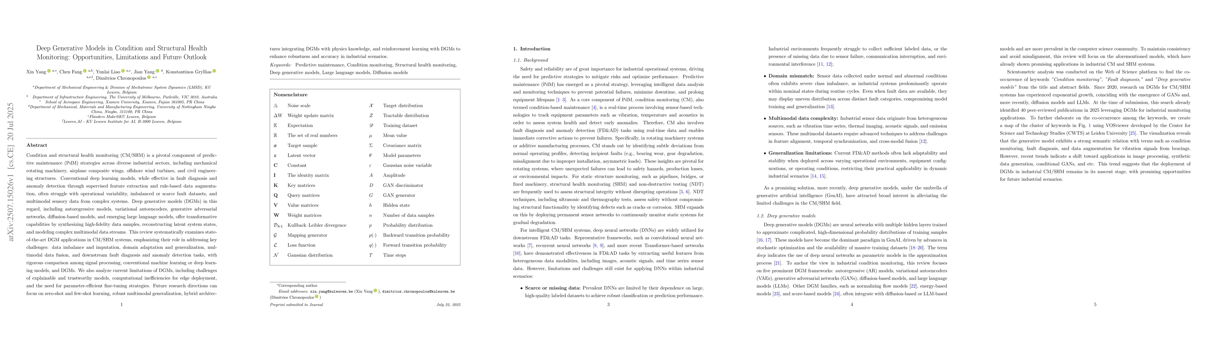 Condition and structural health monitoring (CM/SHM) is a pivotal component of predictive maintenance (PdM) strategies across diverse industrial sectors, including mechanical rotating machinery, airplane composite wings, offshore wind turbines, and civil engineering structures. Conventional deep learning models, while effective in fault diagnosis and anomaly detection through supervised feature extraction and rule-based data augmentation, often struggle with operational variability, imbalanced or scarce fault datasets, and multimodal sensory data from complex systems. Deep generative models (DGMs) in this regard, including autoregressive models, variational autoencoders, generative adversarial networks, diffusion-based models, and emerging large language models, offer transformative capabilities by synthesizing high-fidelity data samples, reconstructing latent system states, and modeling complex multimodal data streams. This review systematically examines state-of-the-art DGM applications in CM/SHM systems, emphasizing their role in addressing key challenges: data imbalance and imputation, domain adaptation and generalization, multimodal data fusion, and downstream fault diagnosis and anomaly detection tasks, with rigorous comparison among signal processing, conventional machine learning or deep learning models, and DGMs. We also analyze current limitations of DGMs, including challenges of explainable and trustworthy models, computational inefficiencies for edge deployment, and the need for parameter-efficient fine-tuning strategies. Future research directions can focus on zero-shot and few-shot learning, robust multimodal generalization, hybrid architectures integrating DGMs with physics knowledge, and reinforcement learning with DGMs to enhance robustness and accuracy in industrial scenarios.