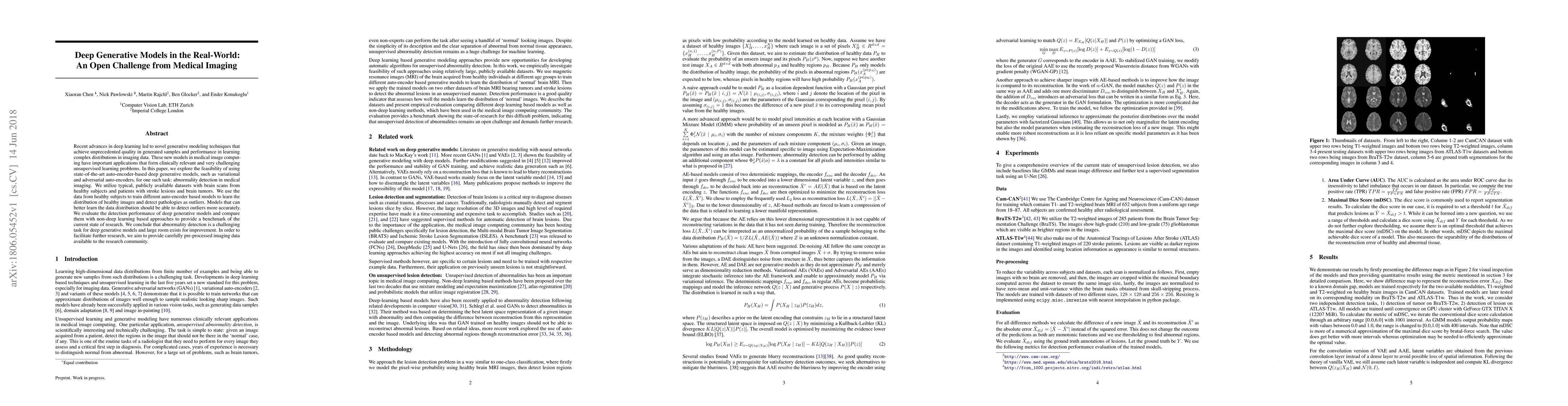Recent advances in deep learning led to novel generative modeling techniques that achieve unprecedented quality in generated samples and performance in learning complex distributions in imaging data. These new models in medical image computing have important applications that form clinically relevant and very challenging unsupervised learning problems. In this paper, we explore the feasibility of using state-of-the-art auto-encoder-based deep generative models, such as variational and adversarial auto-encoders, for one such task: abnormality detection in medical imaging. We utilize typical, publicly available datasets with brain scans from healthy subjects and patients with stroke lesions and brain tumors. We use the data from healthy subjects to train different auto-encoder based models to learn the distribution of healthy images and detect pathologies as outliers. Models that can better learn the data distribution should be able to detect outliers more accurately. We evaluate the detection performance of deep generative models and compare them with non-deep learning based approaches to provide a benchmark of the current state of research. We conclude that abnormality detection is a challenging task for deep generative models and large room exists for improvement. In order to facilitate further research, we aim to provide carefully pre-processed imaging data available to the research community.