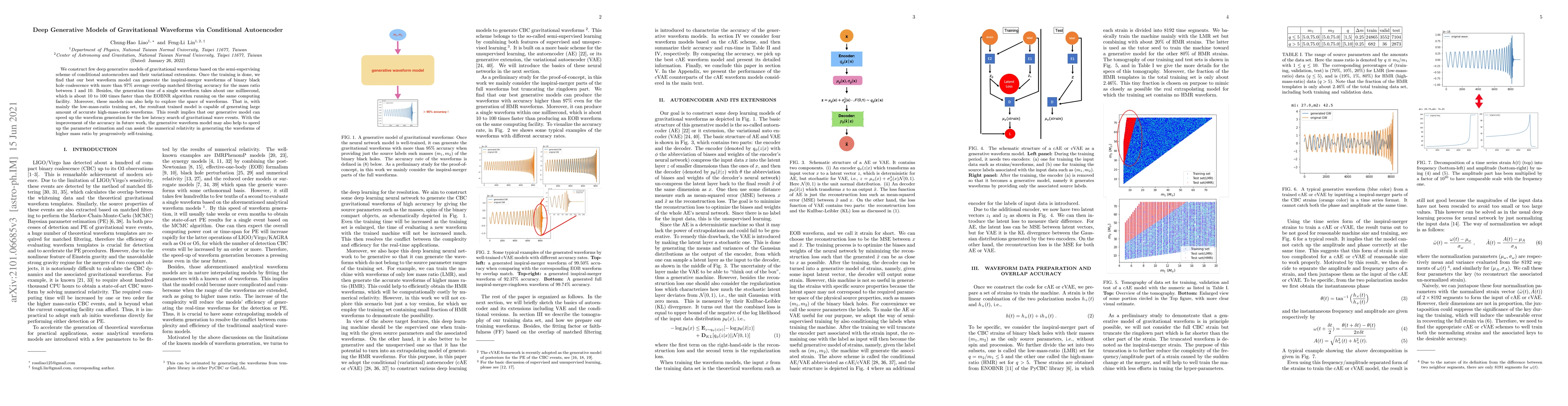 The paper introduces deep generative models using conditional autoencoders and their variational extensions for generating accurate gravitational waveforms, significantly faster than traditional methods.