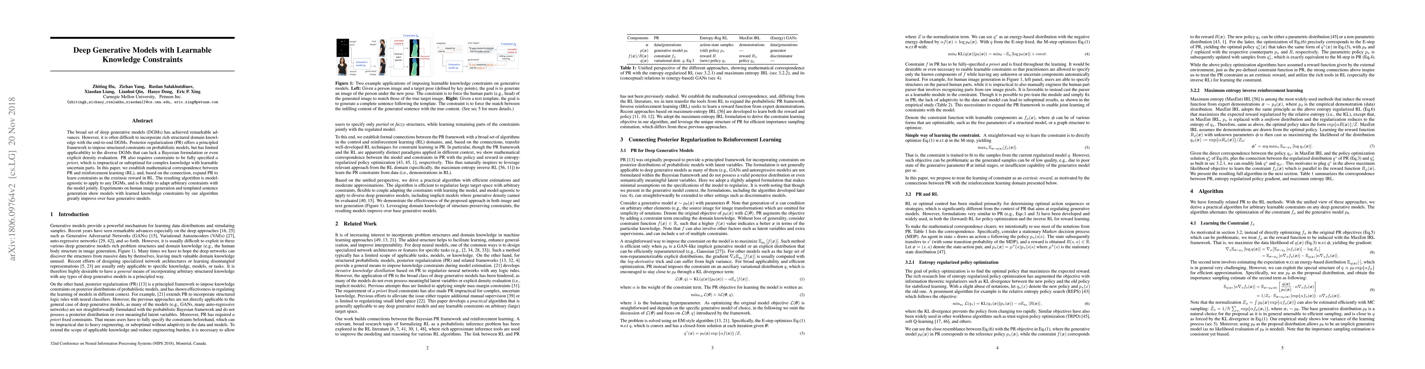 The broad set of deep generative models (DGMs) has achieved remarkable advances. However, it is often difficult to incorporate rich structured domain knowledge with the end-to-end DGMs. Posterior regularization (PR) offers a principled framework to impose structured constraints on probabilistic models, but has limited applicability to the diverse DGMs that can lack a Bayesian formulation or even explicit density evaluation. PR also requires constraints to be fully specified a priori, which is impractical or suboptimal for complex knowledge with learnable uncertain parts. In this paper, we establish mathematical correspondence between PR and reinforcement learning (RL), and, based on the connection, expand PR to learn constraints as the extrinsic reward in RL. The resulting algorithm is model-agnostic to apply to any DGMs, and is flexible to adapt arbitrary constraints with the model jointly. Experiments on human image generation and templated sentence generation show models with learned knowledge constraints by our algorithm greatly improve over base generative models.