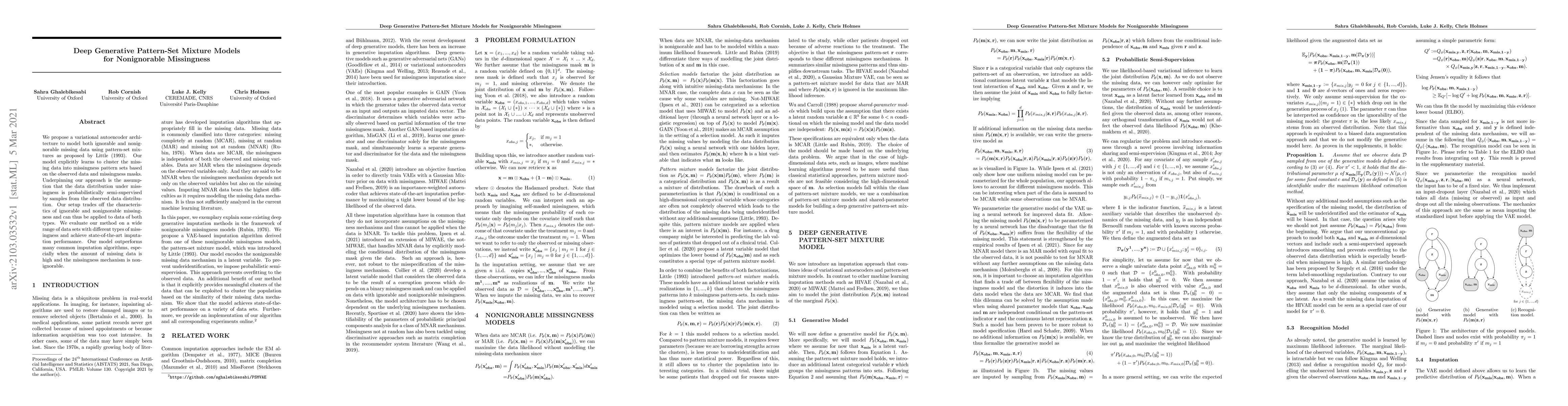 We propose a variational autoencoder architecture to model both ignorable and nonignorable missing data using pattern-set mixtures as proposed by Little (1993). Our model explicitly learns to cluster the missing data into missingness pattern sets based on the observed data and missingness masks. Underpinning our approach is the assumption that the data distribution under missingness is probabilistically semi-supervised by samples from the observed data distribution. Our setup trades off the characteristics of ignorable and nonignorable missingness and can thus be applied to data of both types. We evaluate our method on a wide range of data sets with different types of missingness and achieve state-of-the-art imputation performance. Our model outperforms many common imputation algorithms, especially when the amount of missing data is high and the missingness mechanism is nonignorable.