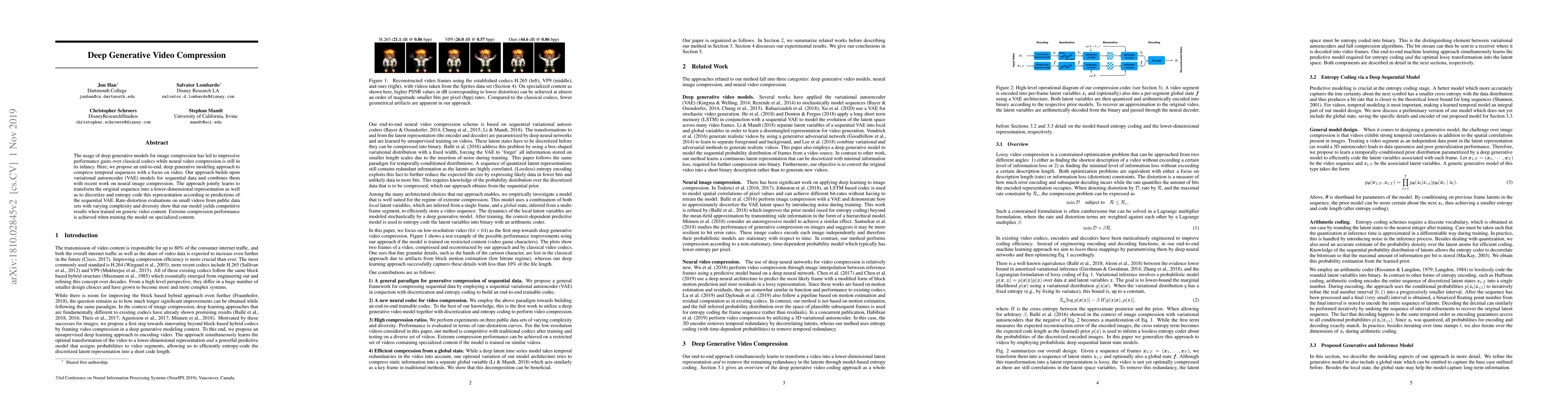 This paper proposes an end-to-end deep generative modeling approach for video compression, leveraging variational autoencoders and neural image compression techniques. The method achieves competitive results with classical codecs, especially when trained on specialized video content.