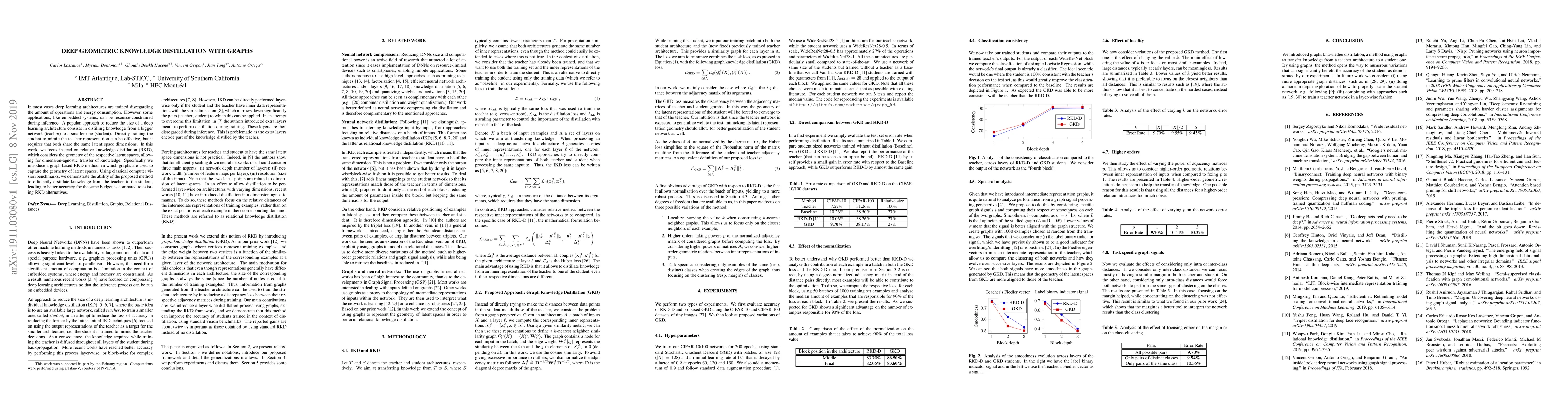 In most cases deep learning architectures are trained disregarding the amount of operations and energy consumption. However, some applications, like embedded systems, can be resource-constrained during inference. A popular approach to reduce the size of a deep learning architecture consists in distilling knowledge from a bigger network (teacher) to a smaller one (student). Directly training the student to mimic the teacher representation can be effective, but it requires that both share the same latent space dimensions. In this work, we focus instead on relative knowledge distillation (RKD), which considers the geometry of the respective latent spaces, allowing for dimension-agnostic transfer of knowledge. Specifically we introduce a graph-based RKD method, in which graphs are used to capture the geometry of latent spaces. Using classical computer vision benchmarks, we demonstrate the ability of the proposed method to efficiently distillate knowledge from the teacher to the student, leading to better accuracy for the same budget as compared to existing RKD alternatives.