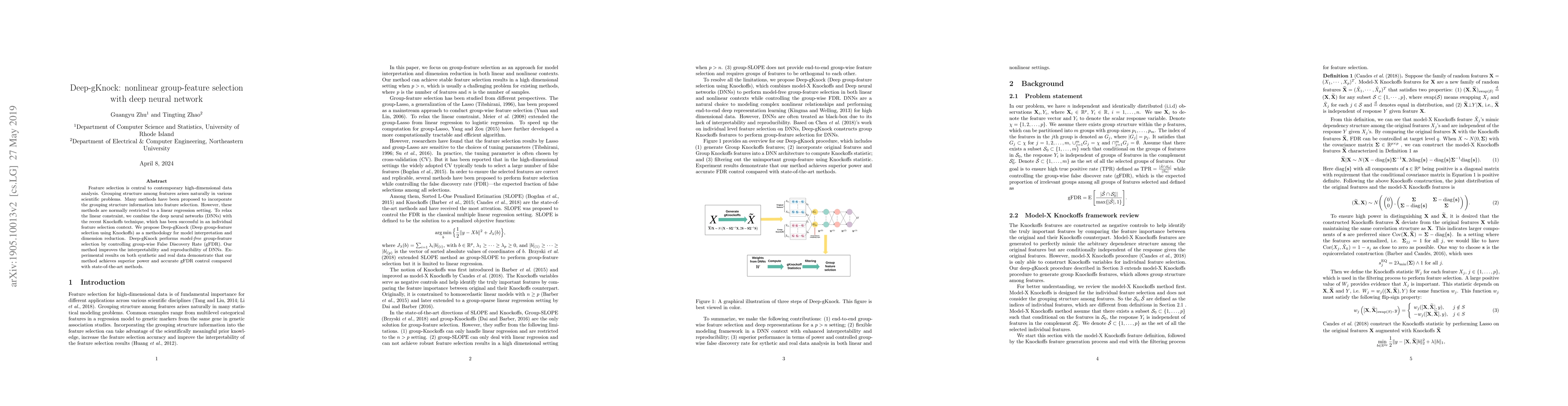 Deep-gKnock integrates deep neural networks with the Knockoffs technique for nonlinear group-feature selection, offering model-free interpretation and dimension reduction while controlling group-wise False Discovery Rate. Experimental results show it outperforms existing methods in interpretability, reproducibility, power, and gFDR accuracy.