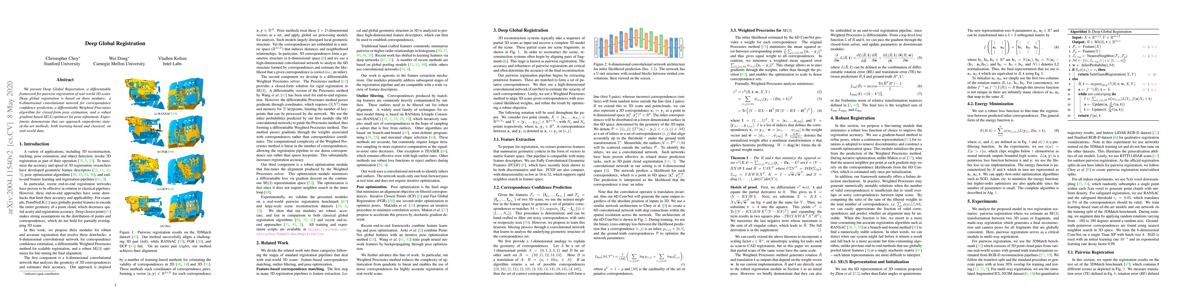 Deep Global Registration introduces a differentiable framework for 3D scan registration, combining convolutional networks, a weighted Procrustes algorithm, and an SE(3) optimizer, outperforming existing methods on real-world datasets. The method achieves superior accuracy in pose estimation and refinement.