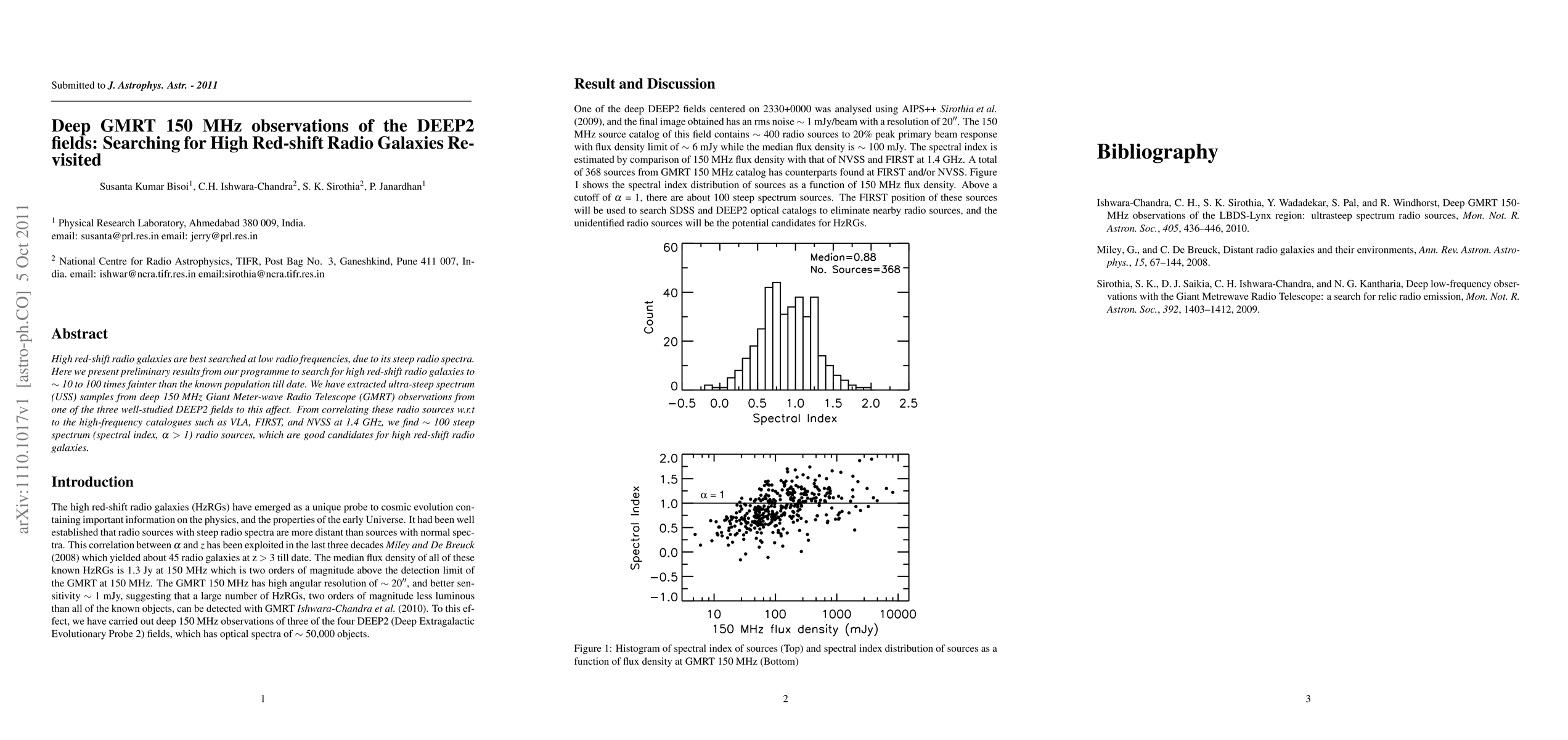 This study utilizes deep 150 MHz GMRT observations to search for high-redshift radio galaxies, identifying ~100 ultra-steep spectrum radio sources that are potential candidates. These sources are correlated with high-frequency catalogues to confirm their steep spectra, indicating fainter populations than previously known.