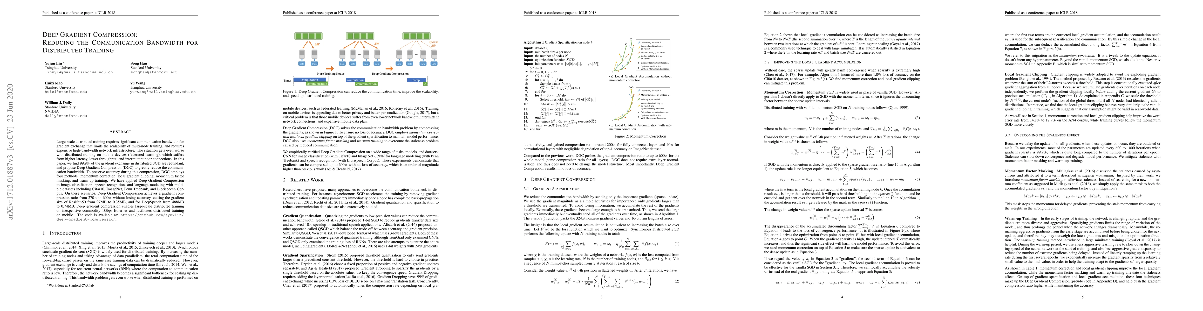 This paper proposes Deep Gradient Compression (DGC) to significantly reduce communication bandwidth in distributed training, identifying 99.9% redundant gradient exchange. DGC employs techniques like momentum correction and local gradient clipping to maintain accuracy, achieving compression ratios from 270x to 600x without loss of accuracy, enabling scalable training on standard network infrastructure.