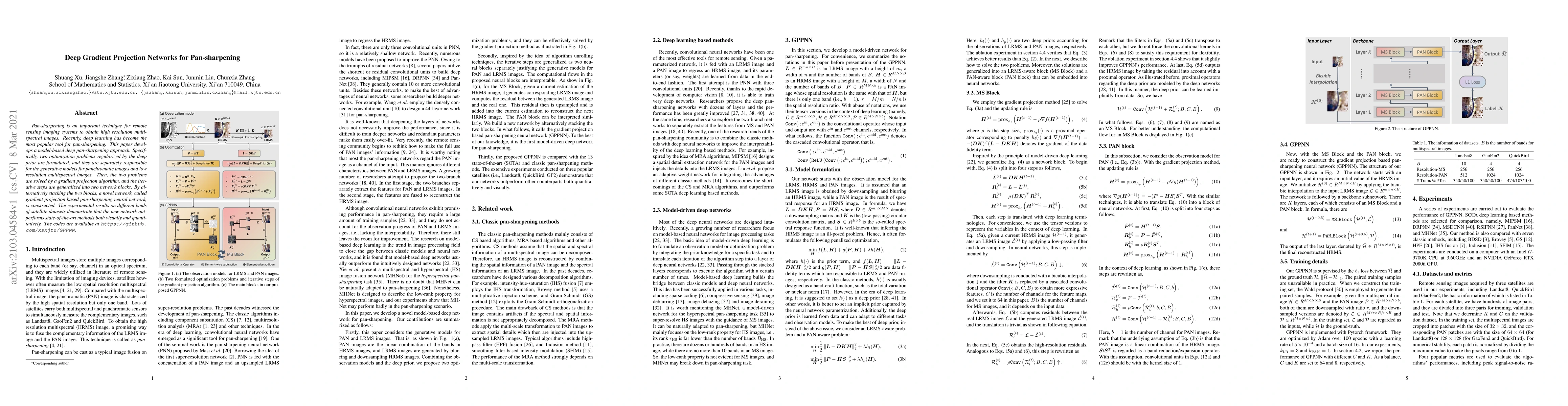 This paper introduces a novel deep gradient projection network for pan-sharpening, which combines two optimization problems to generate high-resolution multispectral images from low-resolution inputs. The proposed network, called GPPNN, outperforms existing methods based on experimental results from satellite datasets.