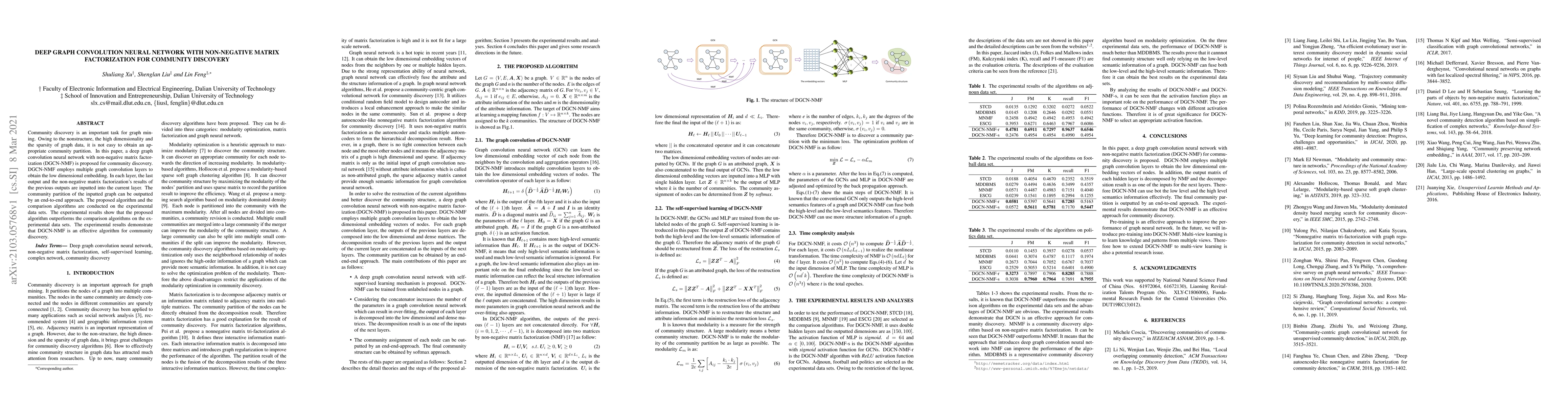 This paper proposes a deep graph convolution neural network with non-negative matrix factorization (DGCN-NMF) for community discovery, achieving superior performance compared to other algorithms through multiple graph convolution layers and an end-to-end approach. Experimental results confirm the effectiveness of DGCN-NMF in partitioning graph communities.