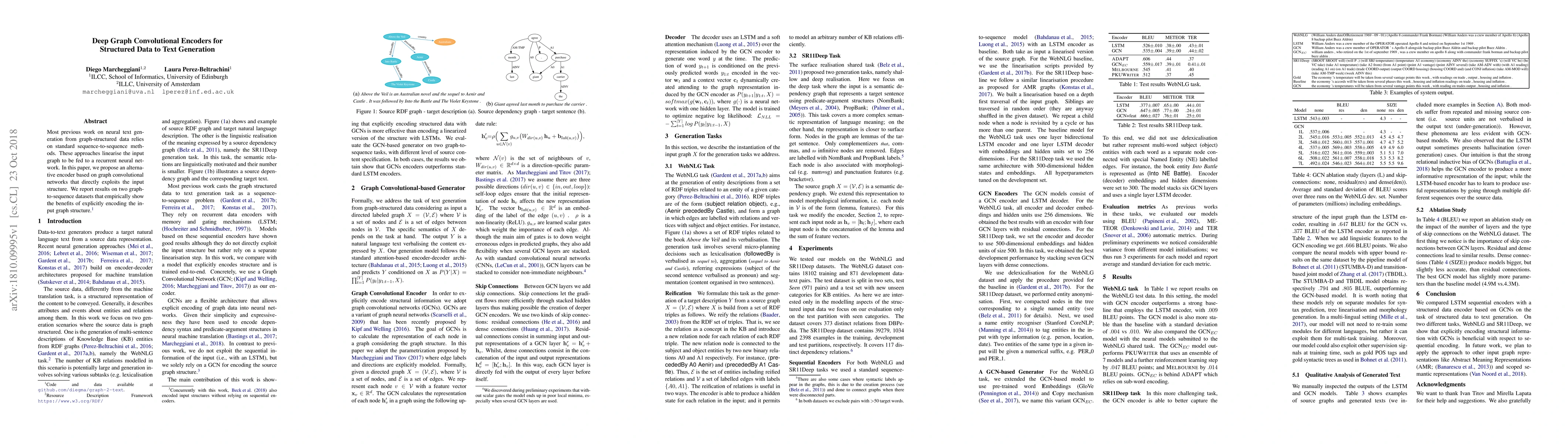 This paper proposes a graph convolutional encoder to generate text from graph-structured data, bypassing the need to linearize the graph, and demonstrates its effectiveness on two datasets.