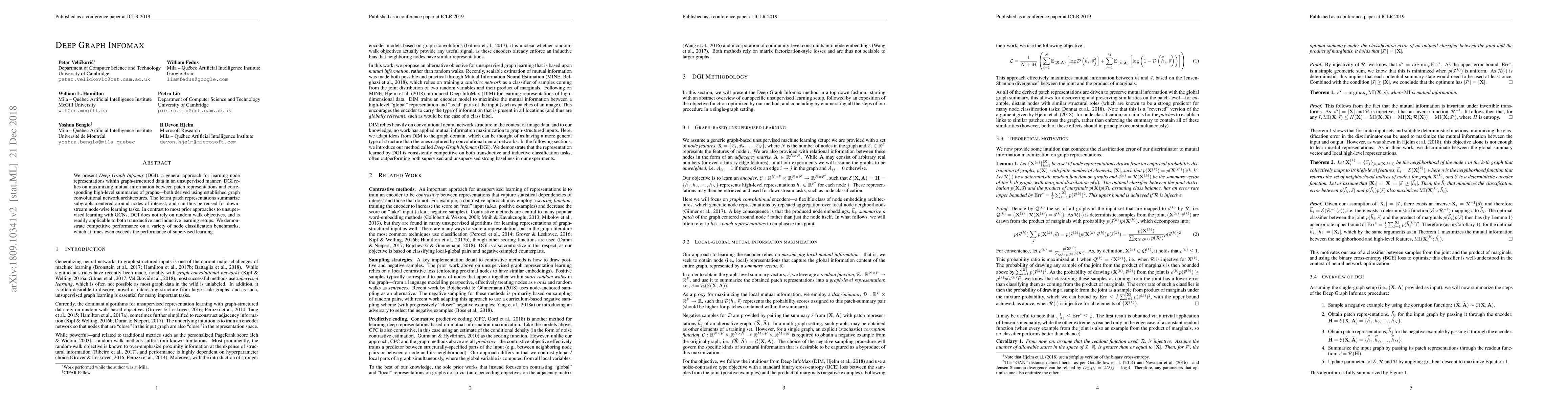 Deep Graph Infomax (DGI) learns node representations in graph-structured data by maximizing mutual information between subgraph patches and high-level graph summaries, using graph convolutional networks. Unlike prior methods, DGI avoids random walk objectives and performs well in both transductive and inductive settings.
