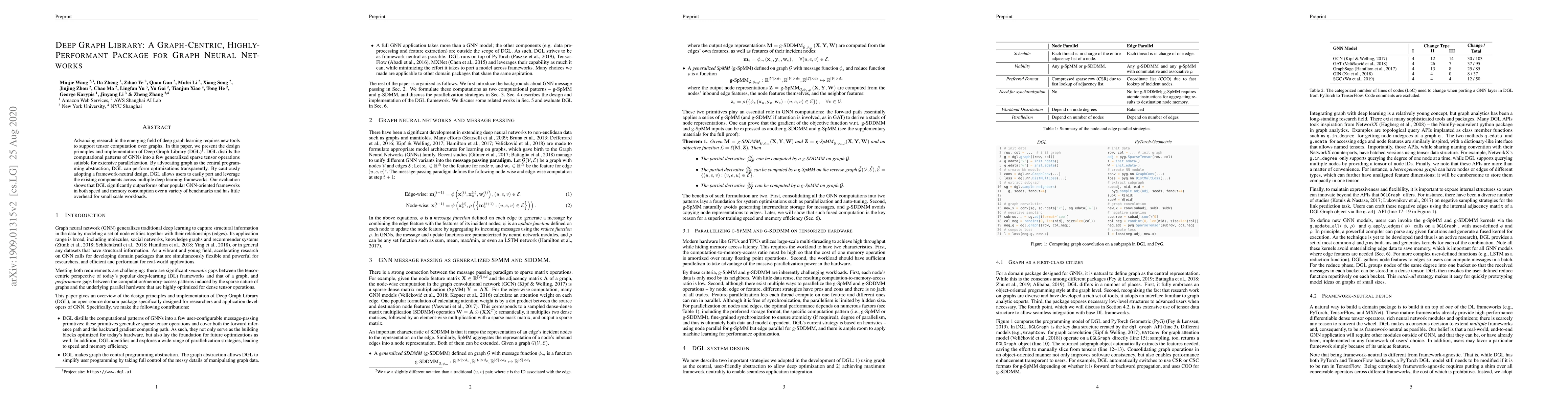 Advancing research in the emerging field of deep graph learning requires new tools to support tensor computation over graphs. In this paper, we present the design principles and implementation of Deep Graph Library (DGL). DGL distills the computational patterns of GNNs into a few generalized sparse tensor operations suitable for extensive parallelization. By advocating graph as the central programming abstraction, DGL can perform optimizations transparently. By cautiously adopting a framework-neutral design, DGL allows users to easily port and leverage the existing components across multiple deep learning frameworks. Our evaluation shows that DGL significantly outperforms other popular GNN-oriented frameworks in both speed and memory consumption over a variety of benchmarks and has little overhead for small scale workloads.
