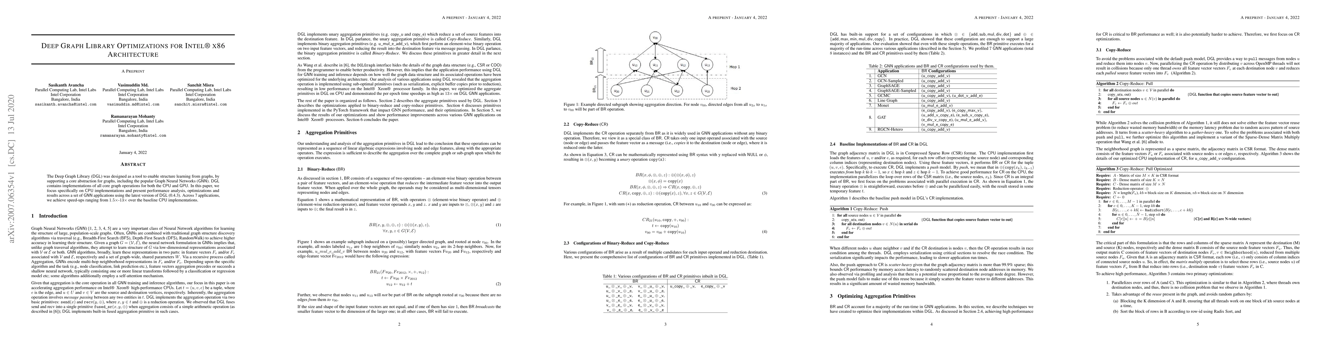 The Deep Graph Library was optimized for Intel x86 architecture, achieving speed-ups of 1.5x-13x over baseline CPU implementations in 7 GNN applications.