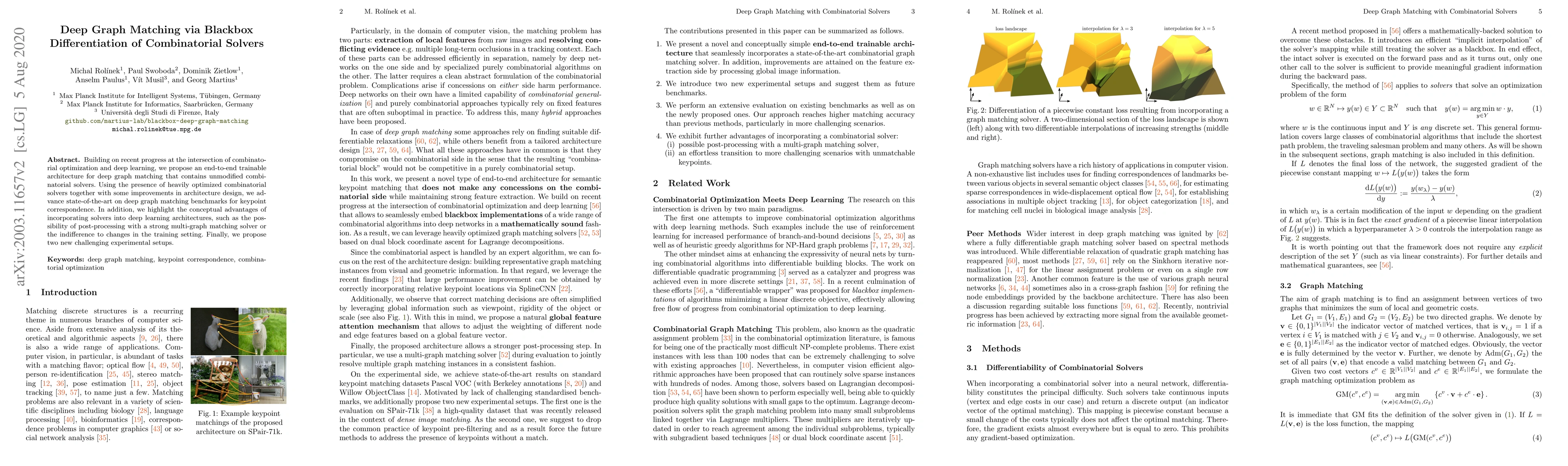 This paper introduces a novel deep graph matching architecture that integrates blackbox differentiation with combinatorial solvers, achieving state-of-the-art performance on benchmarks for keypoint correspondence. The method leverages optimized solvers and improved architecture design, offering benefits like post-processing flexibility and robustness to training setting changes.