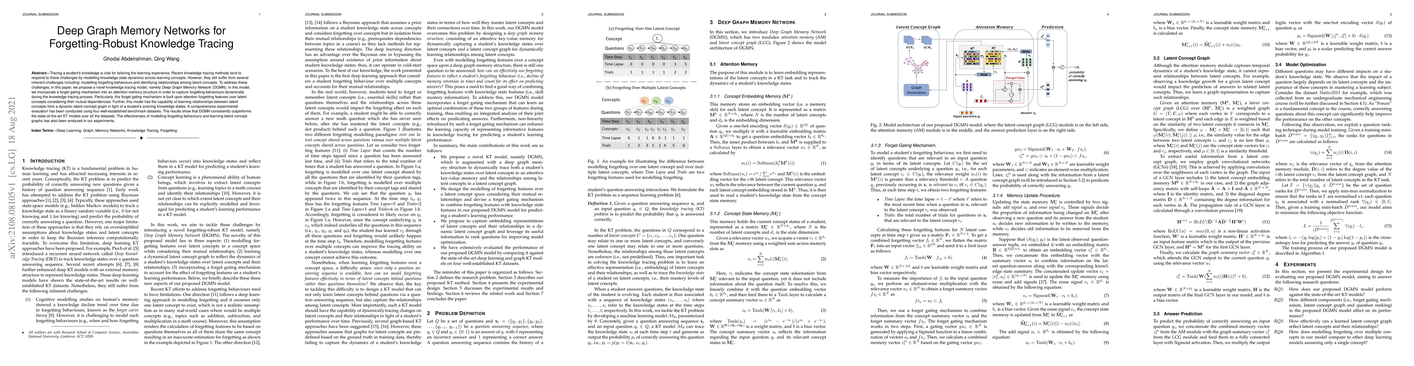 This paper proposes a Deep Graph Memory Network (DGMN) to improve knowledge tracing by dynamically capturing forgetting behaviors and learning relationships among latent concepts. Experimental results show DGMN outperforms existing models, highlighting its effectiveness in addressing forgetting and concept relationship modeling.